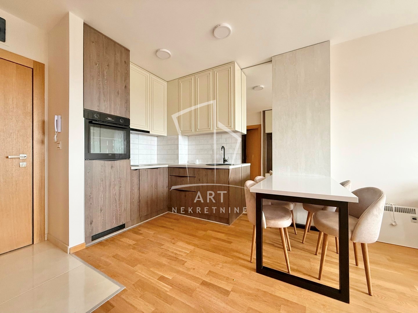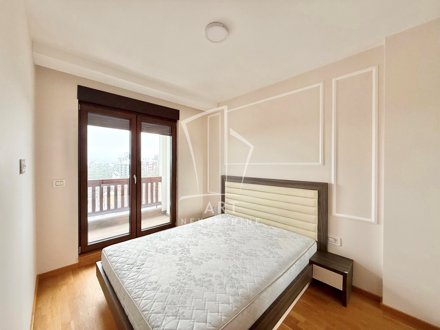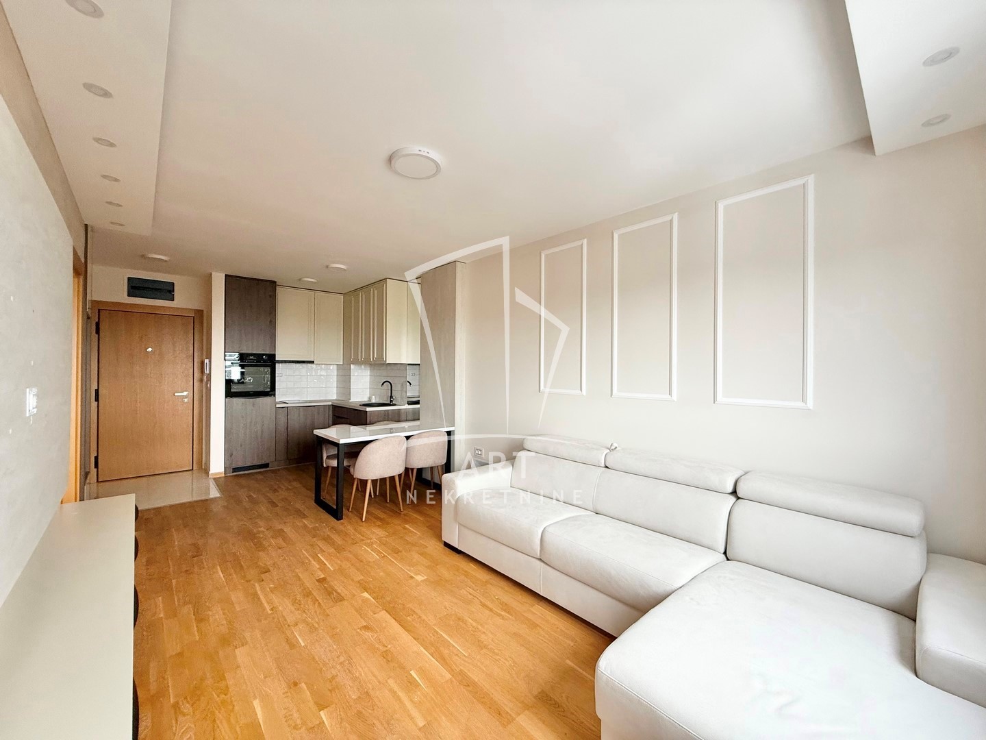 Nalazi se na četvrtom spratu i sastoji se od predsoblja, dnevnog boravka sa kuhinjom i trpezarijom, spavaće sobe, kupatila i terase. Grejanje je na norveške radijatore. Jugozapadno je orijentisan, što mu obezbeđuje obilje prirodnog svetla i prijatnu atmosferu. Stan je opremljen sa novim nameštajem.
