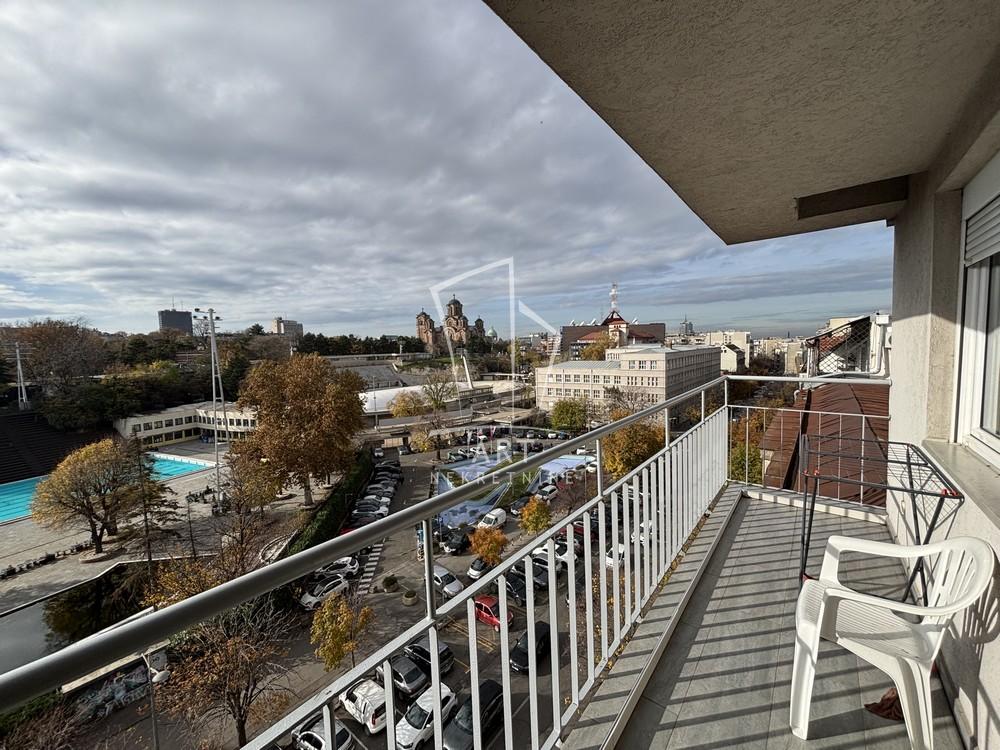 Stan ima terasu sa izuzetanim, otvorenim pogledom na park, bazen i Crkvu Svetog Marka - retko dostupna panorama u ovom delu grada.