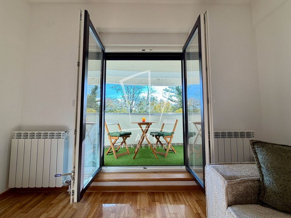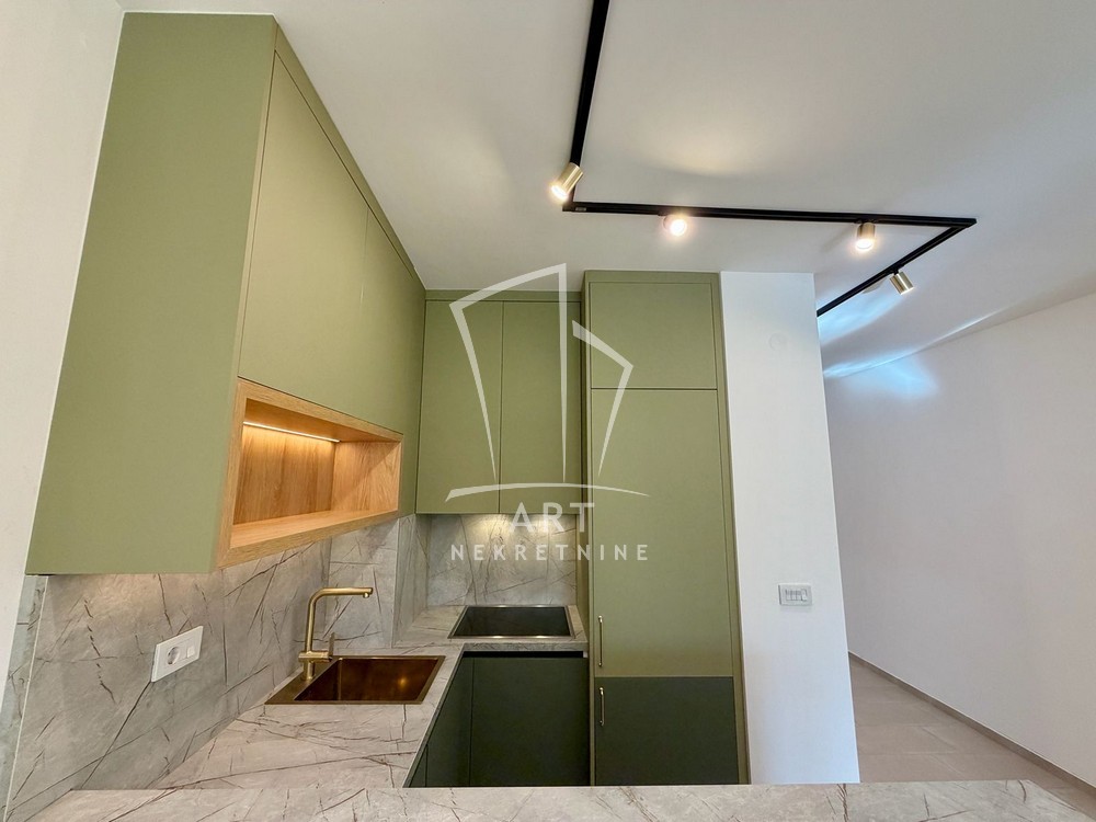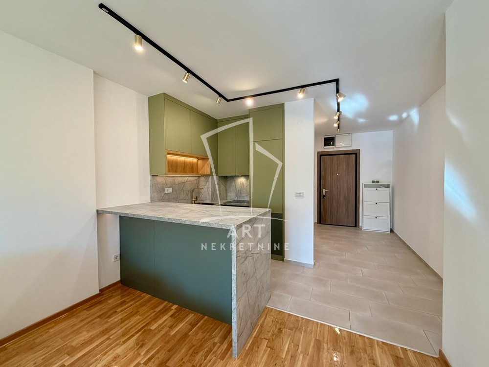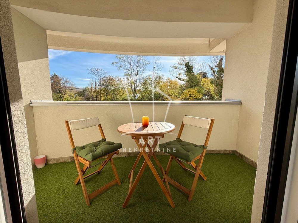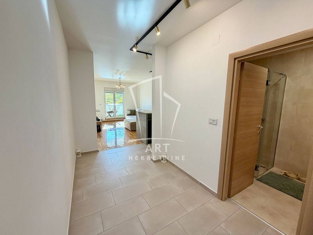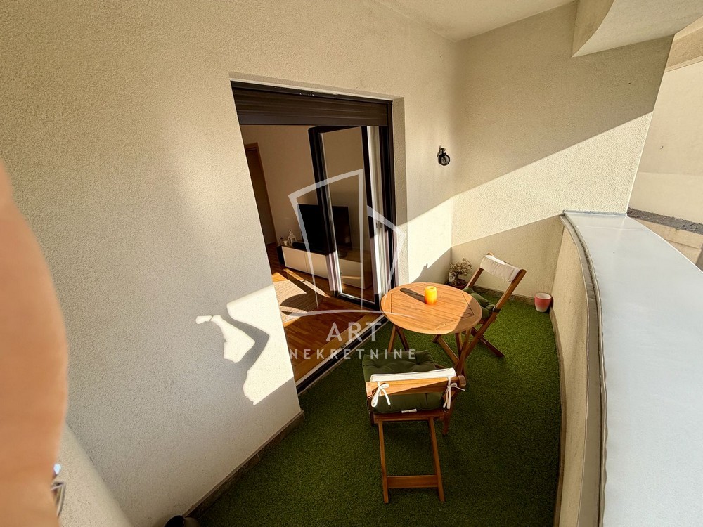 Kompletno je namešten i odmah spreman za useljenje i sadrži: prostranu dnevnu sobu sa udobnom garniturom i TV-om, modernu kuhinju po meri sa mašinom za sudove, rernom i ugradnom pločom, spavaću sobu sa velikim ormarom i bračnim krevetom, kupatilo sa tuš kabinom i mašinom za veš, dve natkrivene terase sa pogledom na mirno zelenilo, grejanje je centralno, PVC stolarija, sigurnosna vrata, interfon i video nadzor.