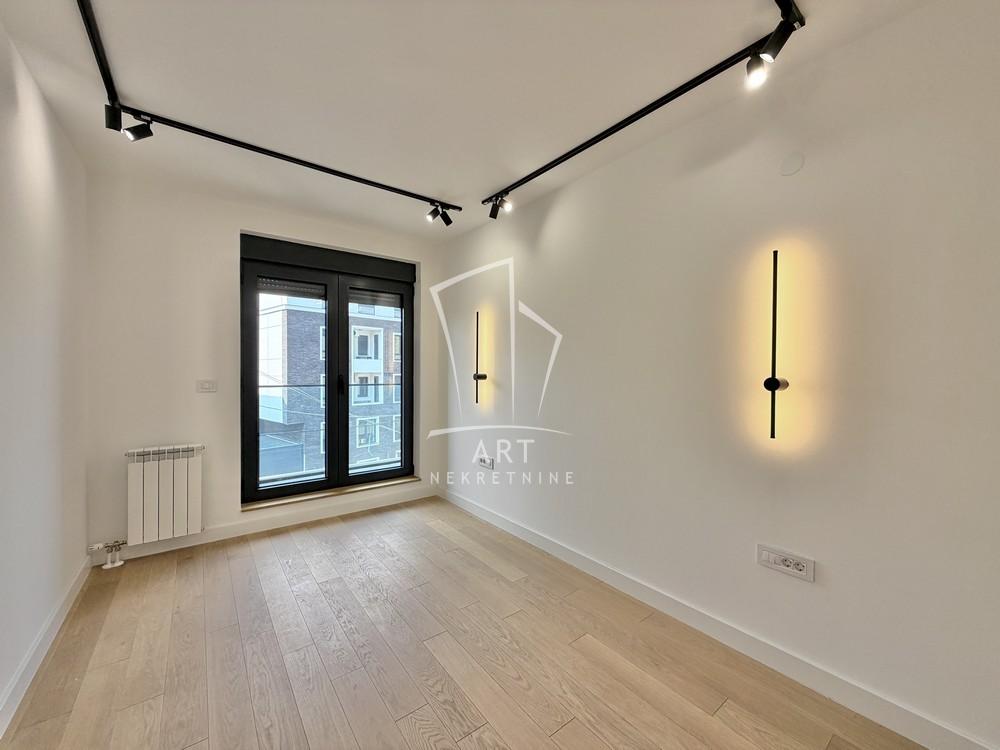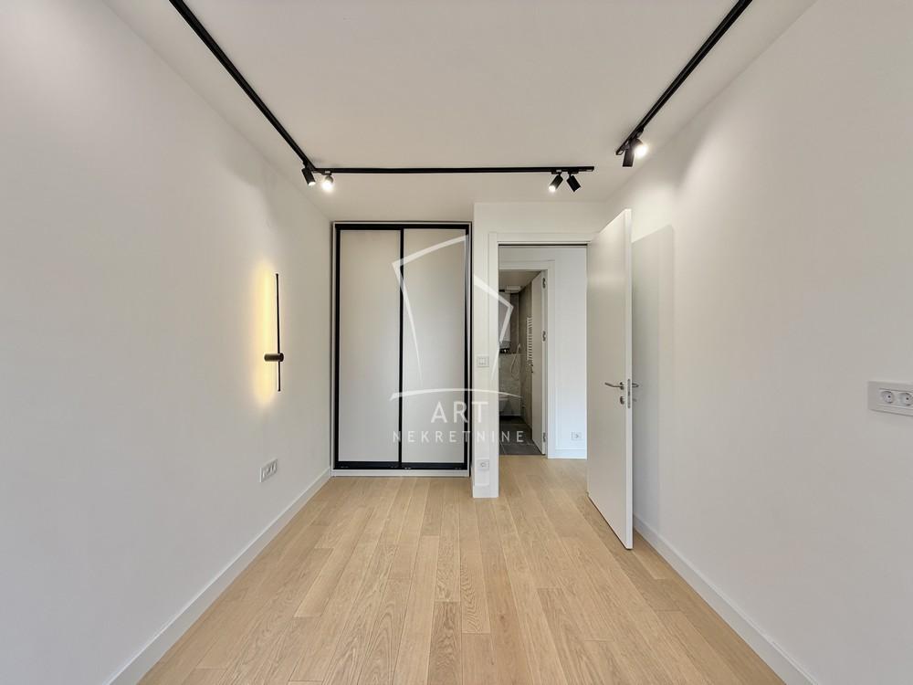 Opremljen je ugradnim plakarima i odlično organozovanom kuhinjom koja poseduje uređaje za kuvanje, sudomašinu i frižider.