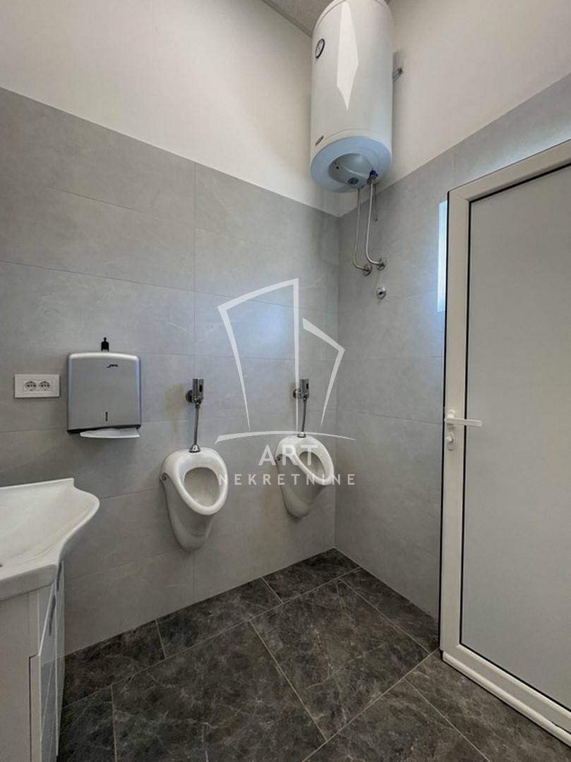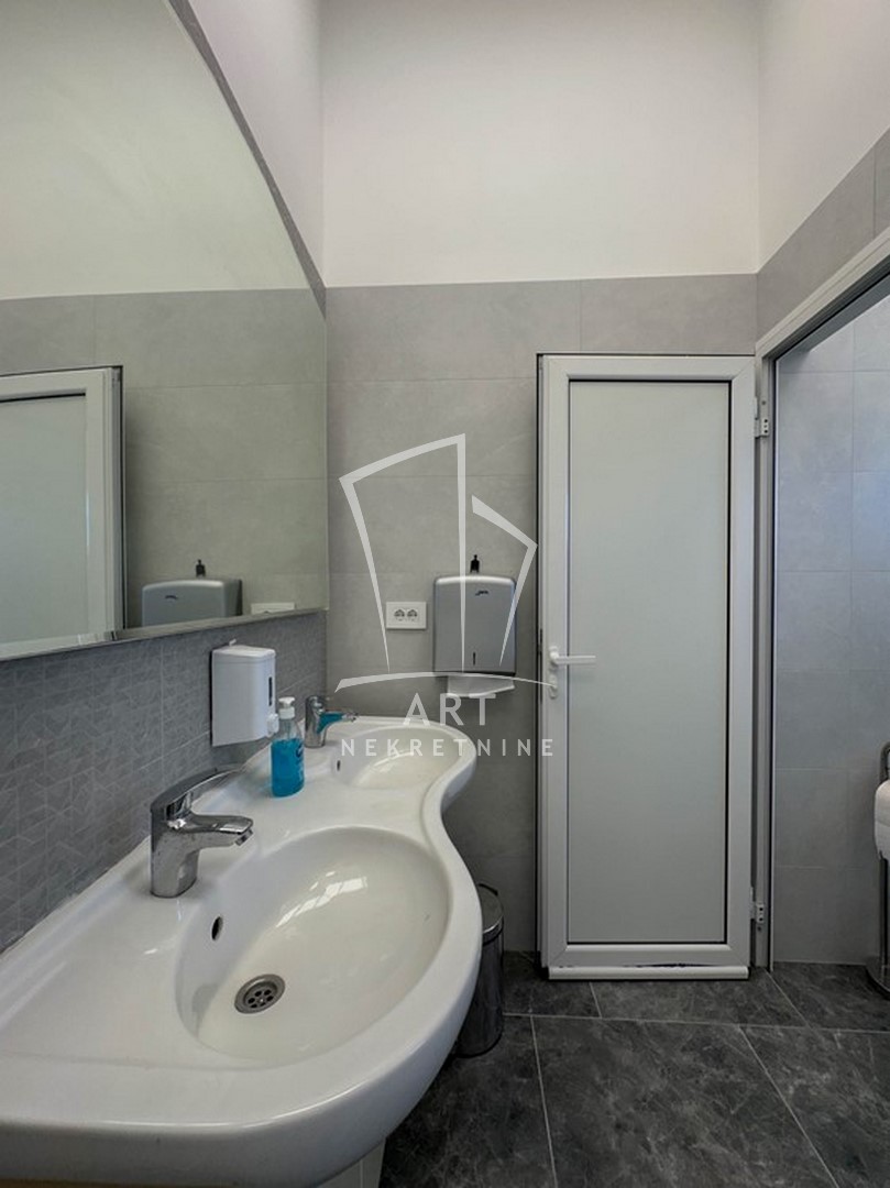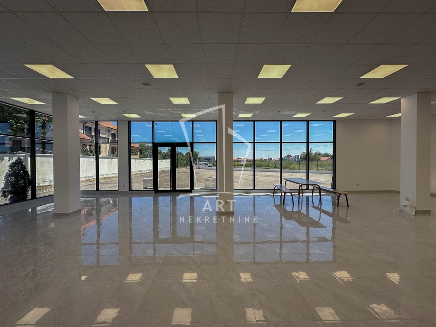 2. Lokal 350m2 Prizemlje: 3.5m visina. Open-space prostor, salon +2 kancelarije, kuhinja i trpezarija, dva toaleta (muški i ženski), italijanska keramika, ekstra lux. podno grejanje,postoji klimatizija (hladjenje i grejanje)