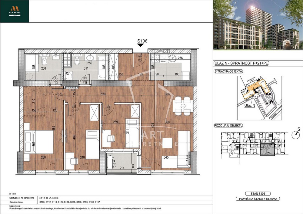 New Minel Residence je novi biser moderne arhitektrure na Novom Beogradu. Stan poseduje 3 spavaće sobe, 2 mokra čvora, lođu, orijentisan je ka Tošinom bunaru. Centalno grejanje sa kalorimetrima. U neposrednoj blizini kompleksa nalaze se: osnovna, dom zdravlja, sportski centar, pijaca, supermarket kao i gradski prevoz.