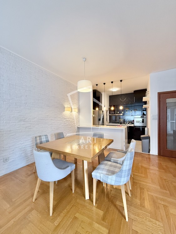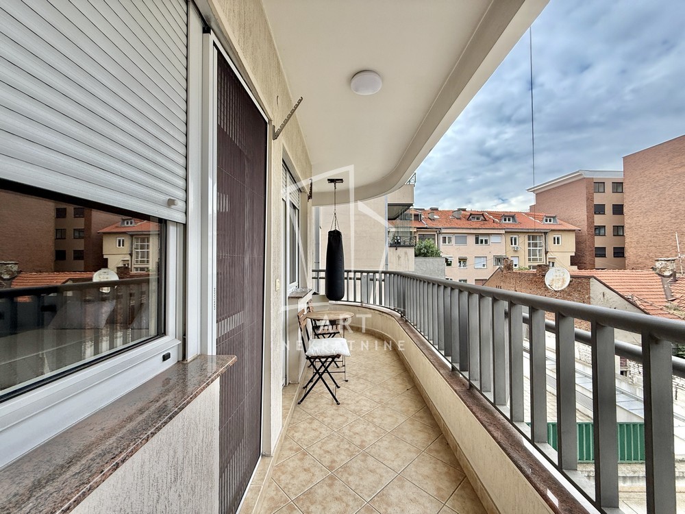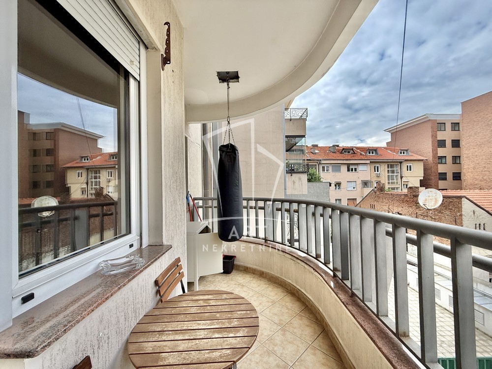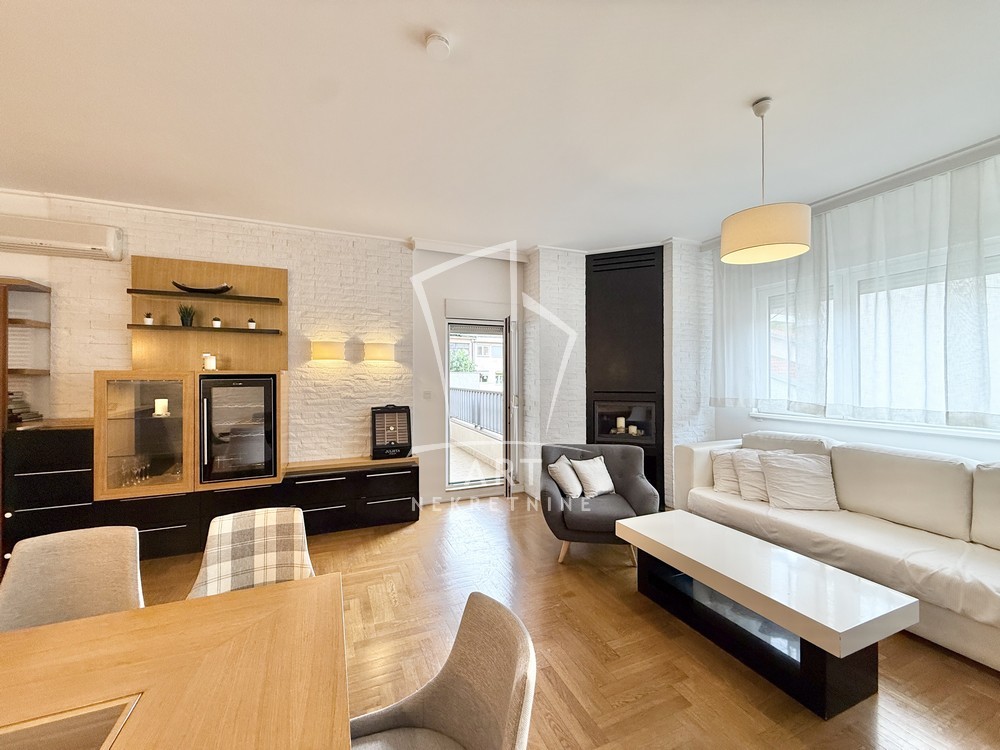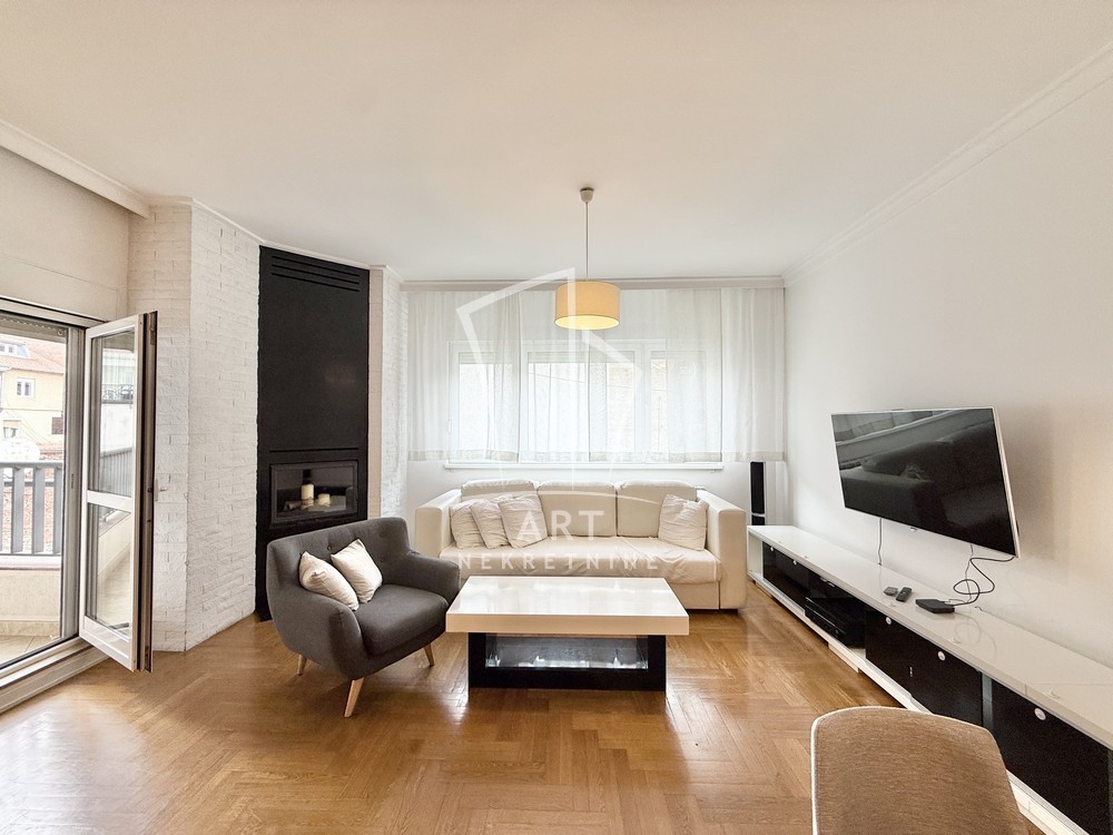 Uknjižen, moderno opremljen trosoban stan, 102 m2, na prvom spratu od četiri sprata, prostrana terasa, lift, cg, interfon, video nadzor, kamin u funkciji.