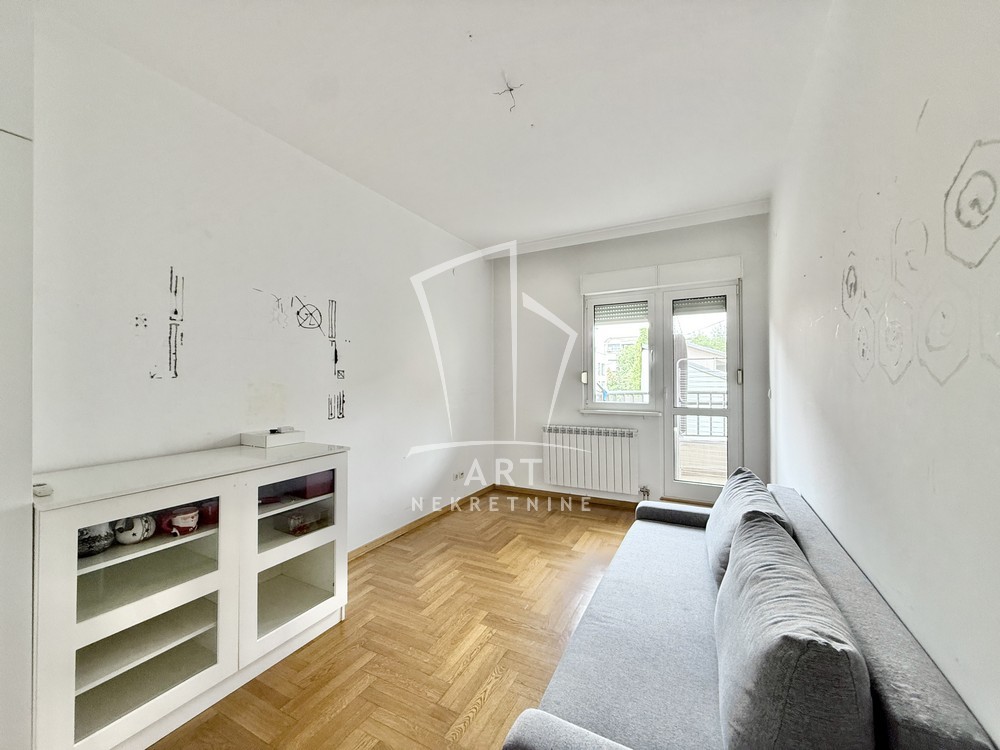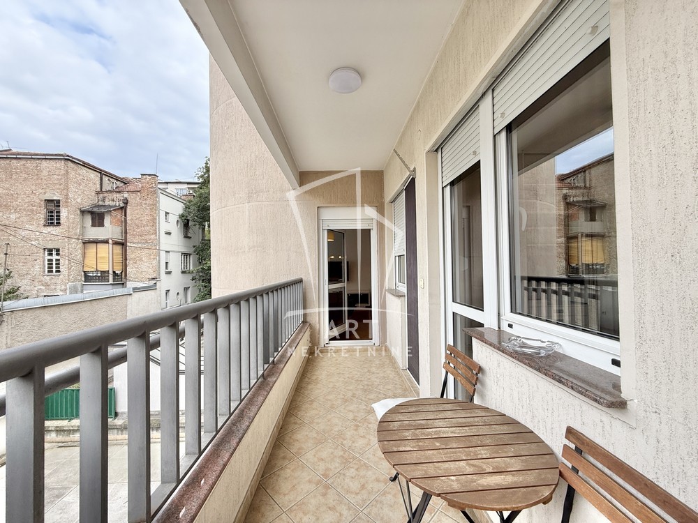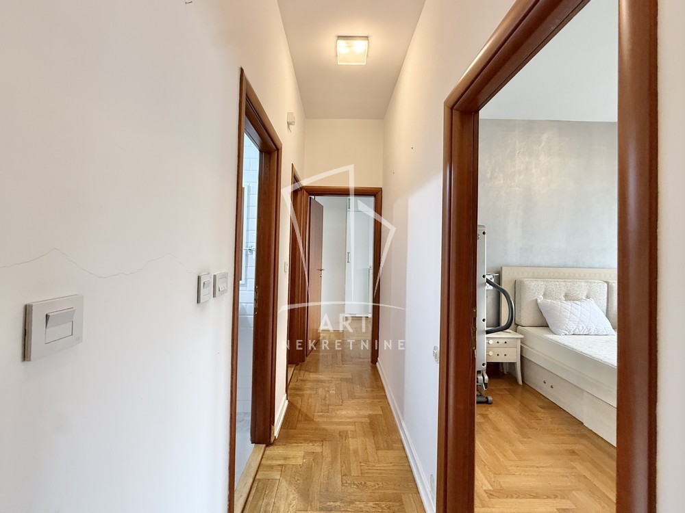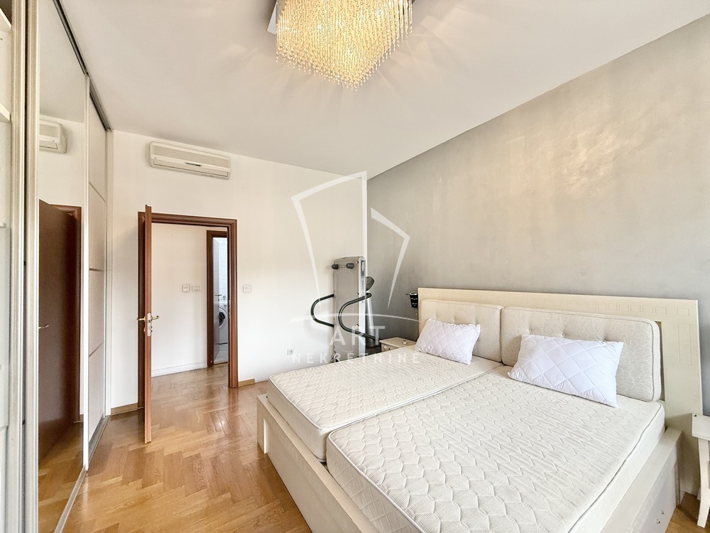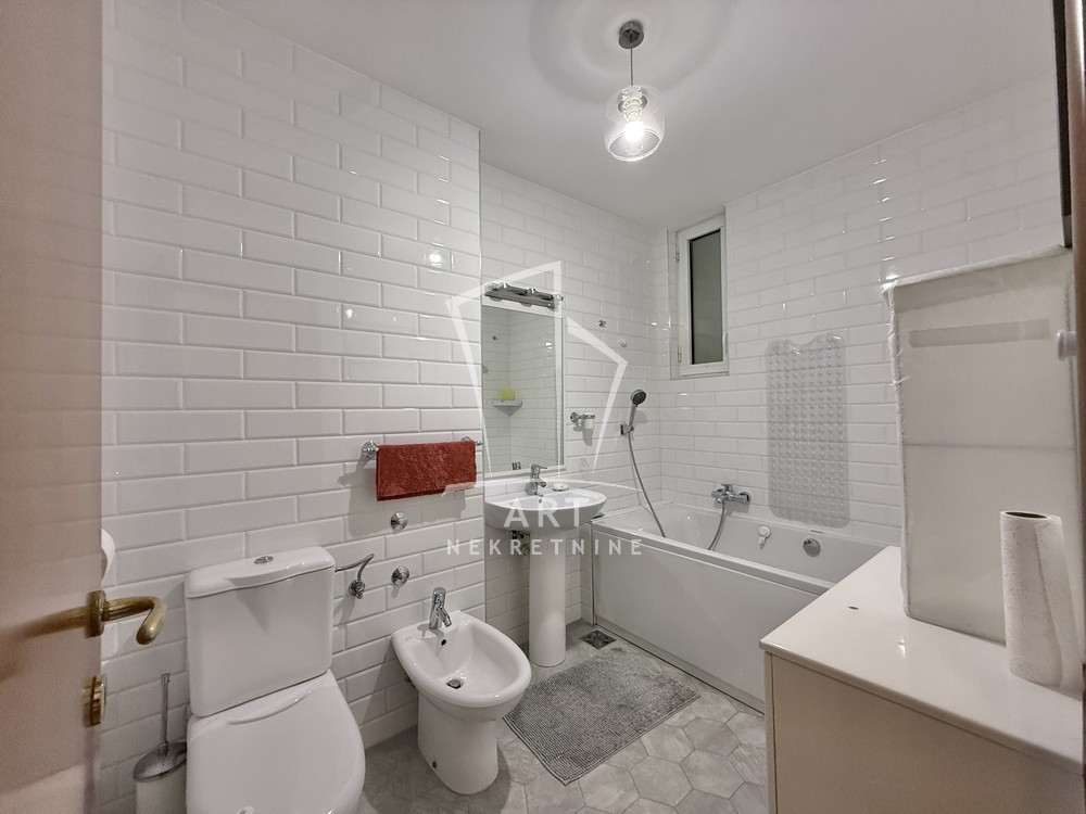 Uknjižen, moderno opremljen trosoban stan, 102 m2, na prvom spratu od četiri sprata, prostrana terasa, lift, cg, interfon, video nadzor, kamin u funkciji.