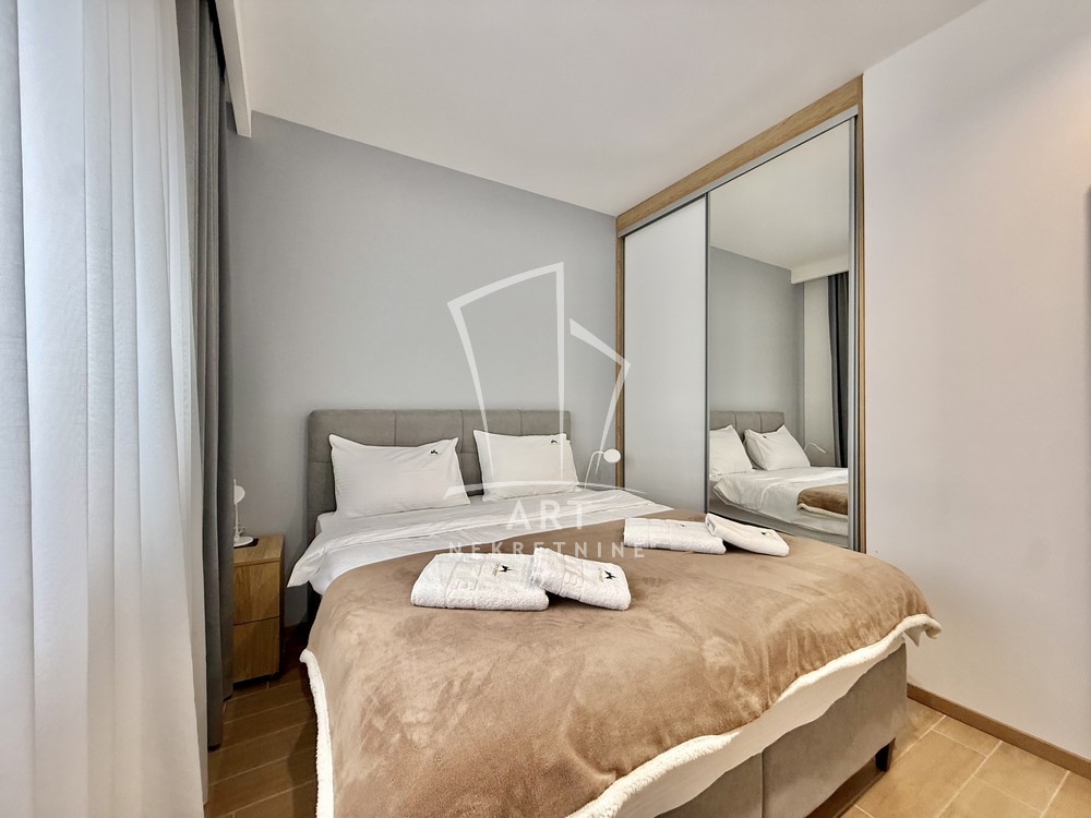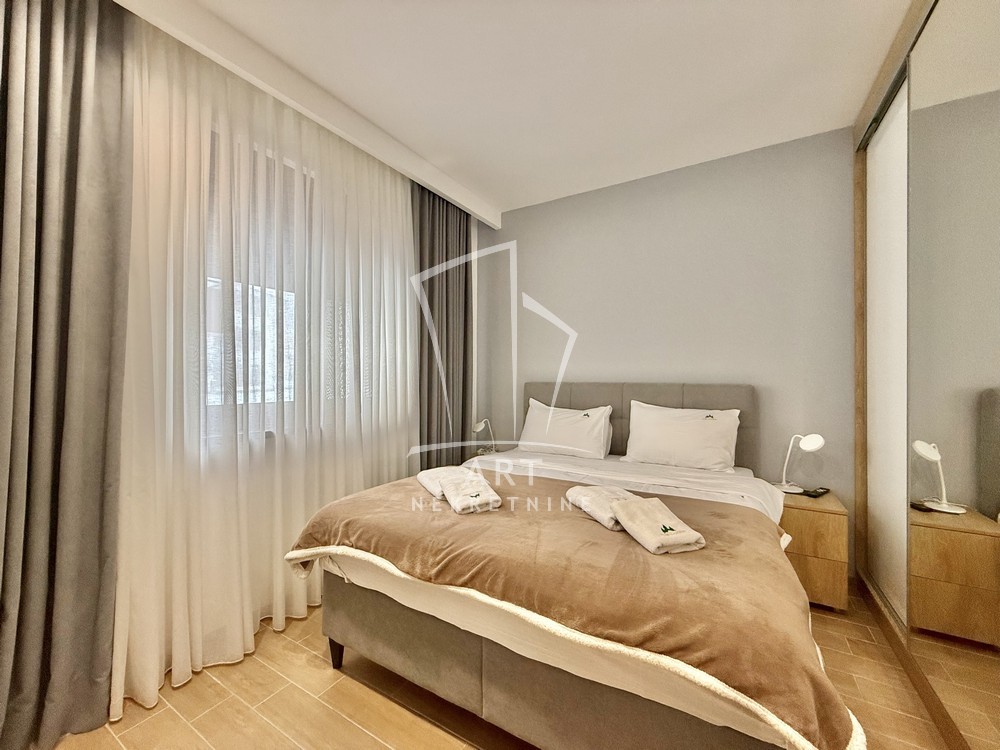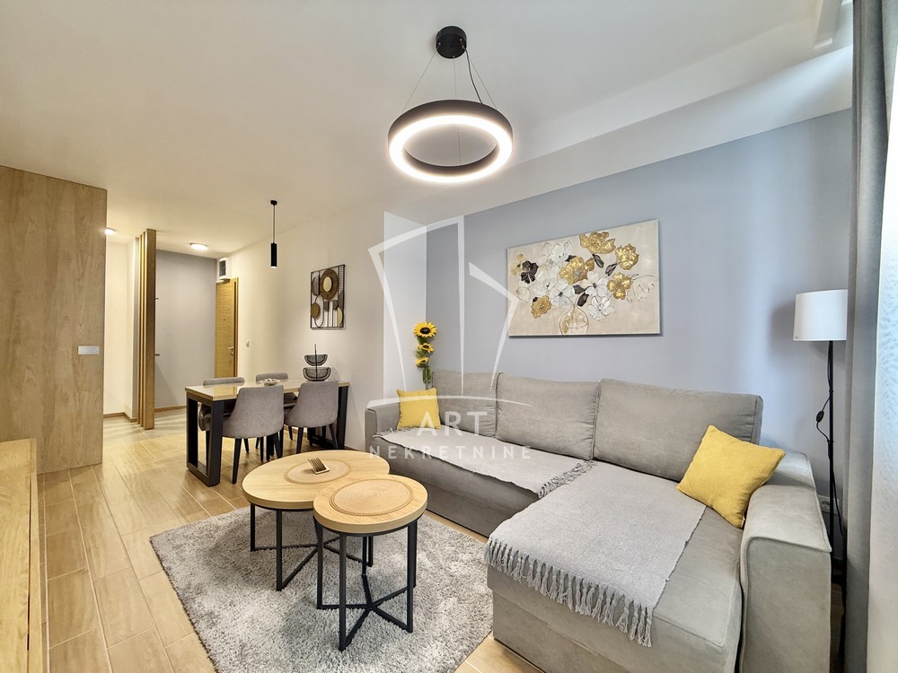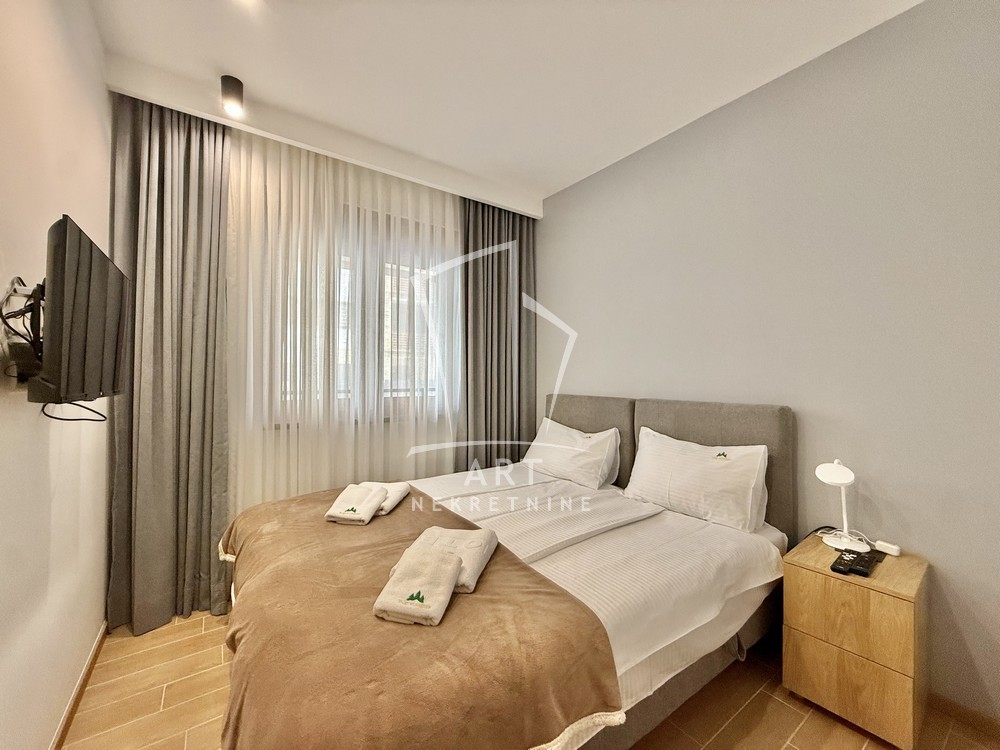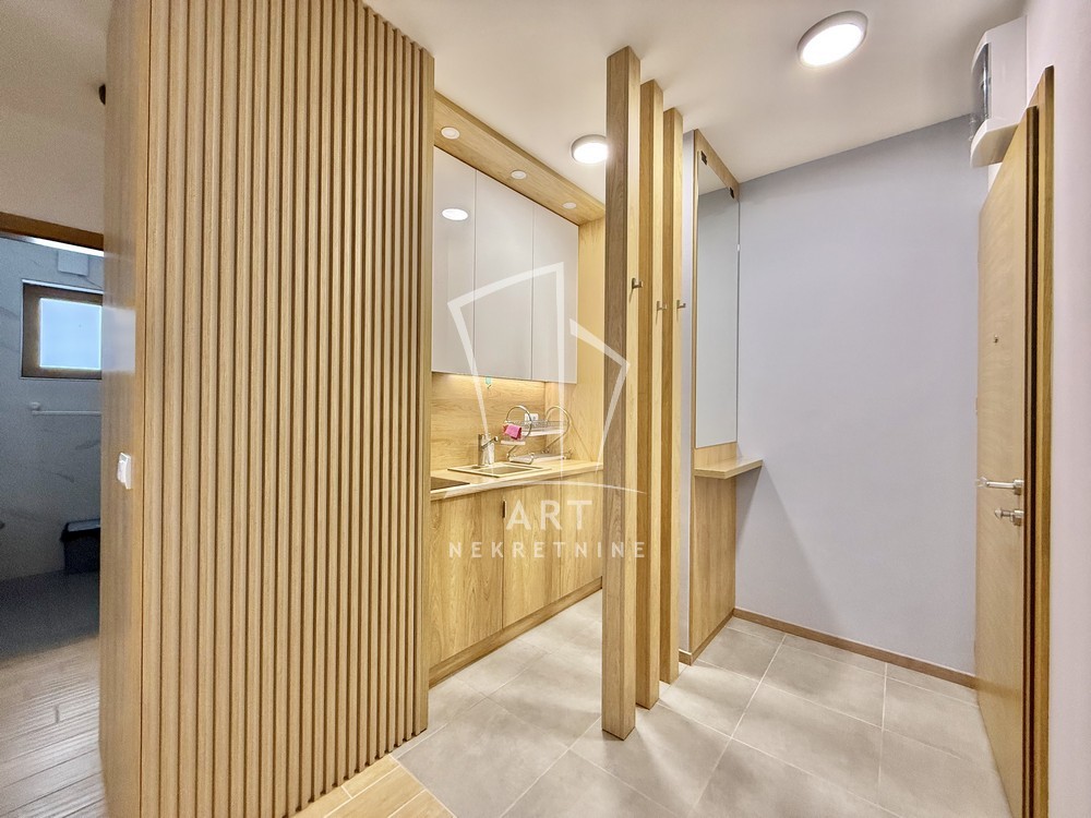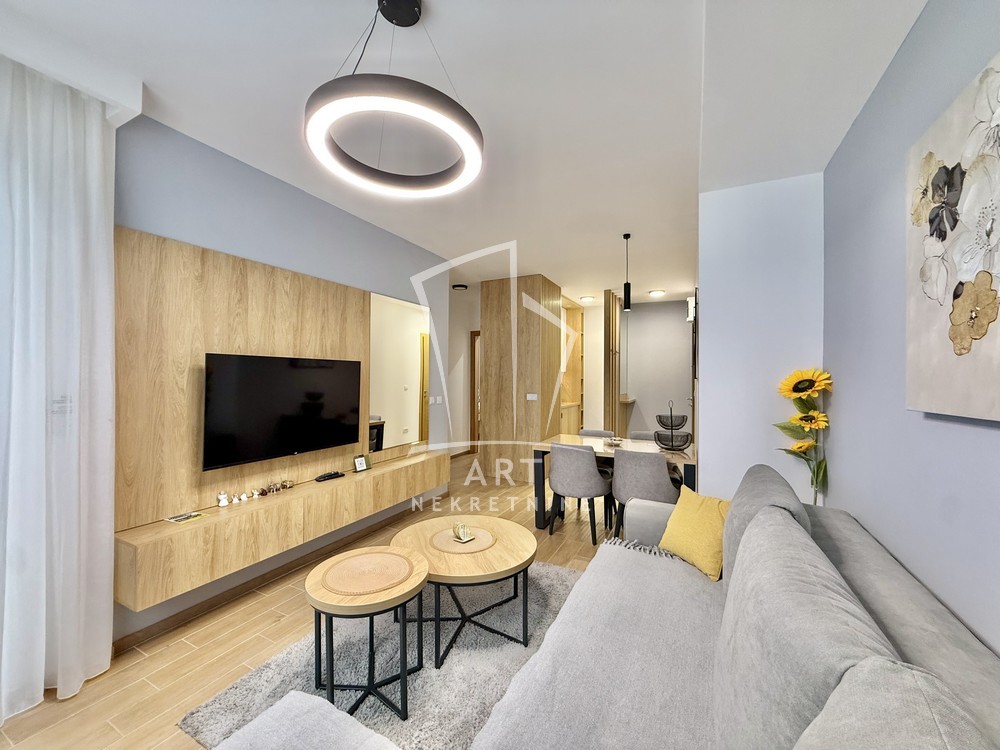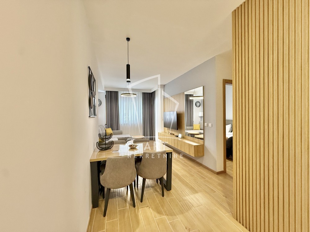 Po strukturi je trosoban i se sastoji se od predsoblja, dnevnog boravka sa kuhinjom i trpezarijom, dve spavaće sobe, kupatila i terase. Nalazi se na prvom spratu od ukupno šest. Moderno je opremljen. Dvostrano je orijentisan, prema jugu i zapadu. Grejanje je na norveške radijatore.