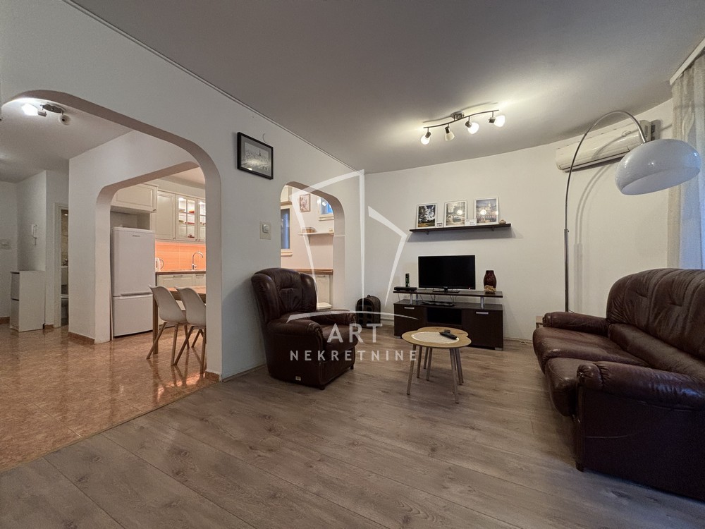 Stan se sastoji od velike i svetle dnevne sobe povezane sa kuhinjom, hodnikom i terasom.