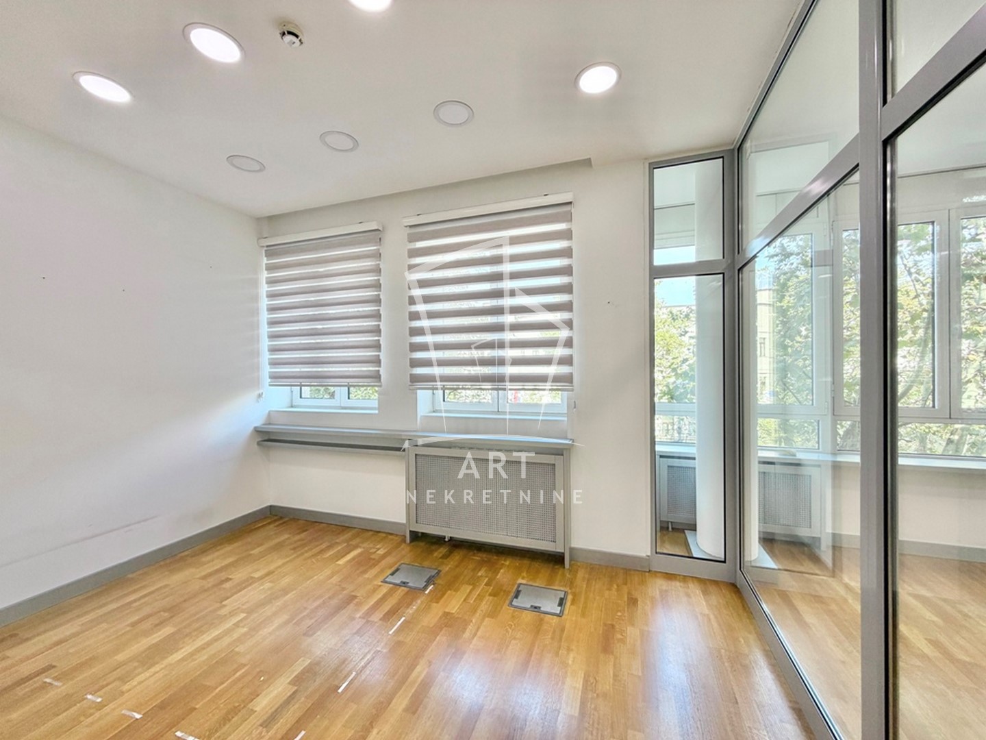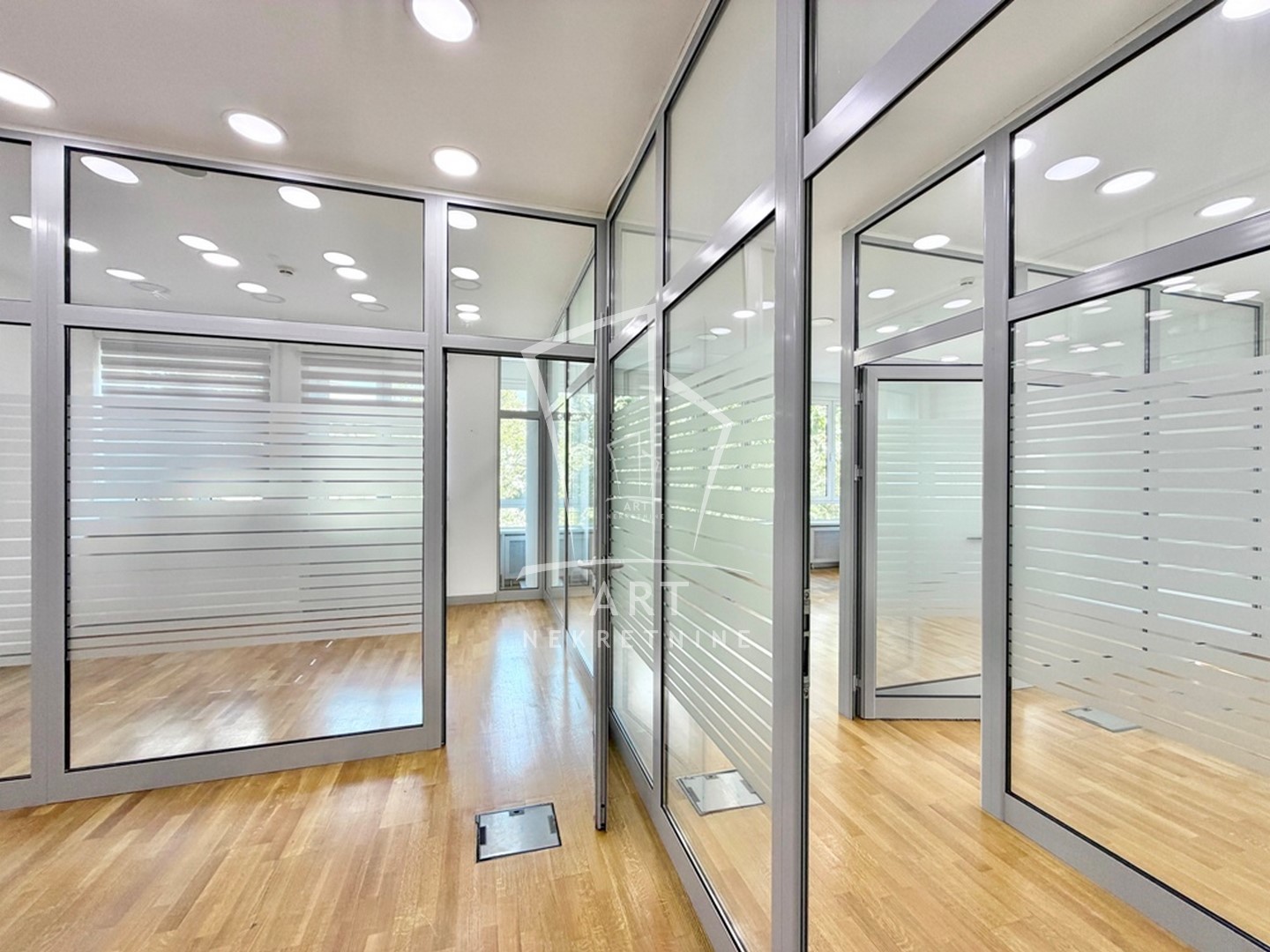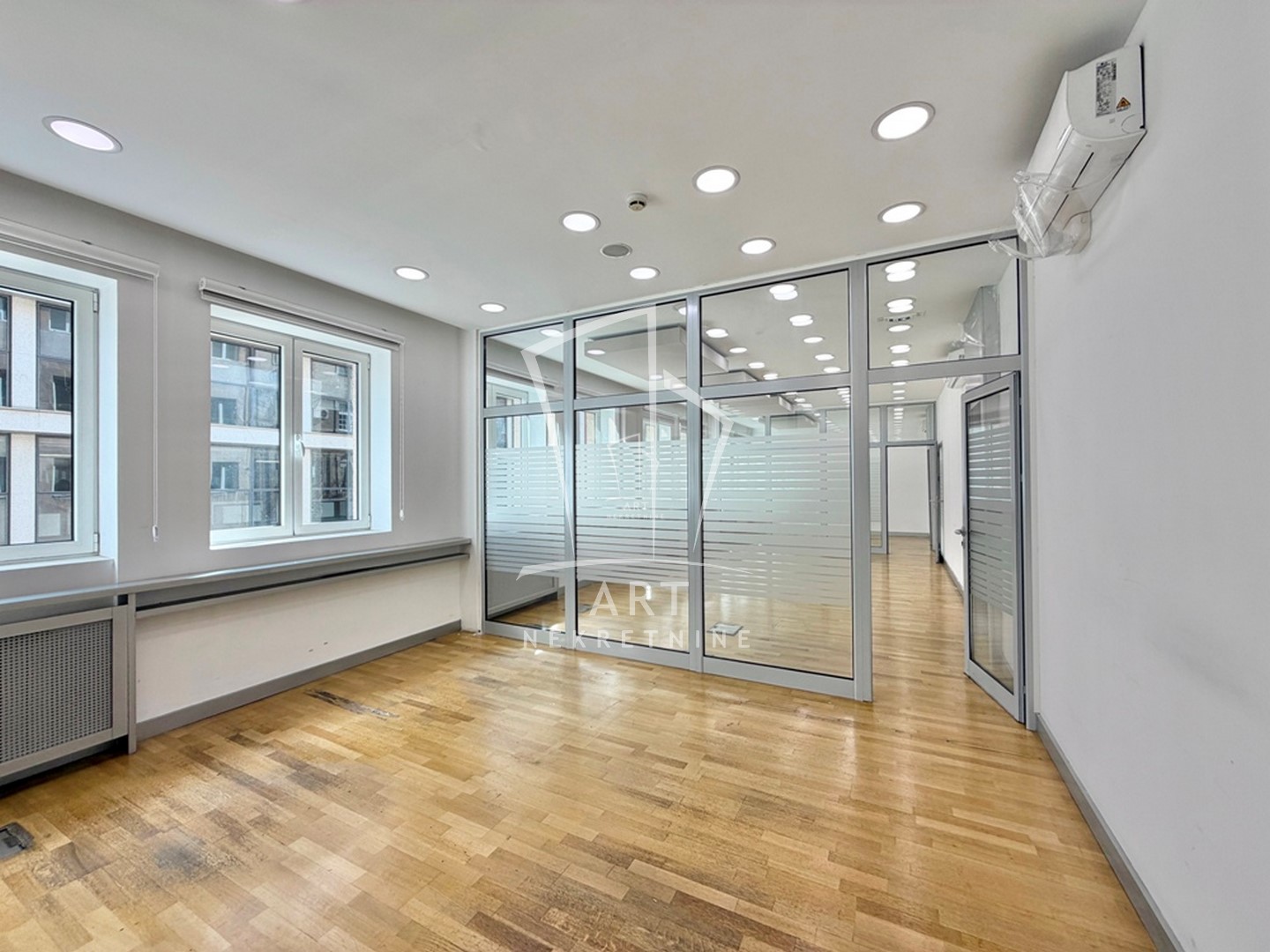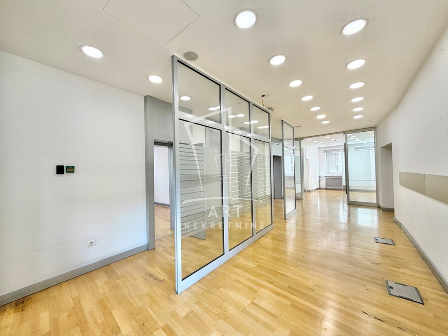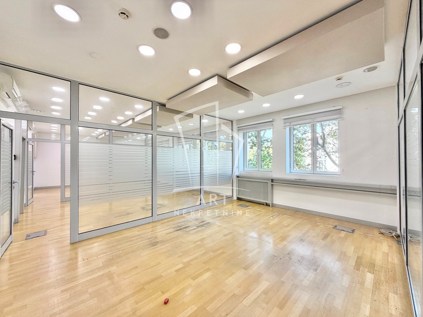 Prostor se dodatno može prilagođavati potrebama zakupca, pošto su pregrade aluminijum staklo. Ima dva ulaza i nalazi se sam na spratu.Optički internet je dostupan u zgradi. Prostor će biti ogrečen i očišćen pre ulaska novog zakupca.Servisni troškovi su 5.55 Evra/m2