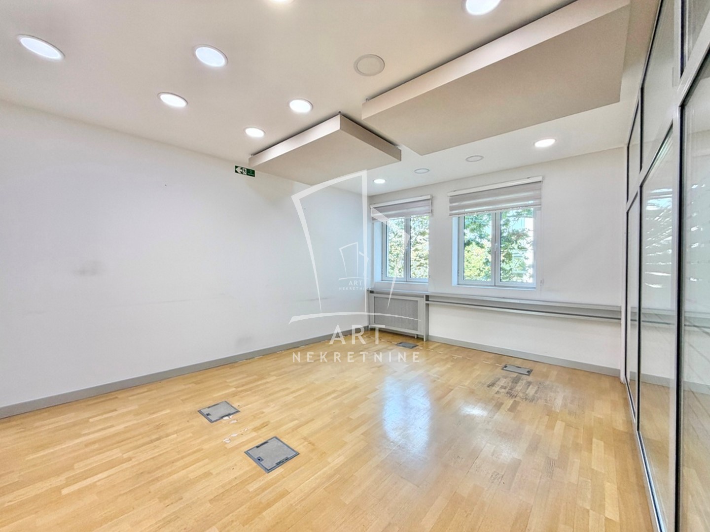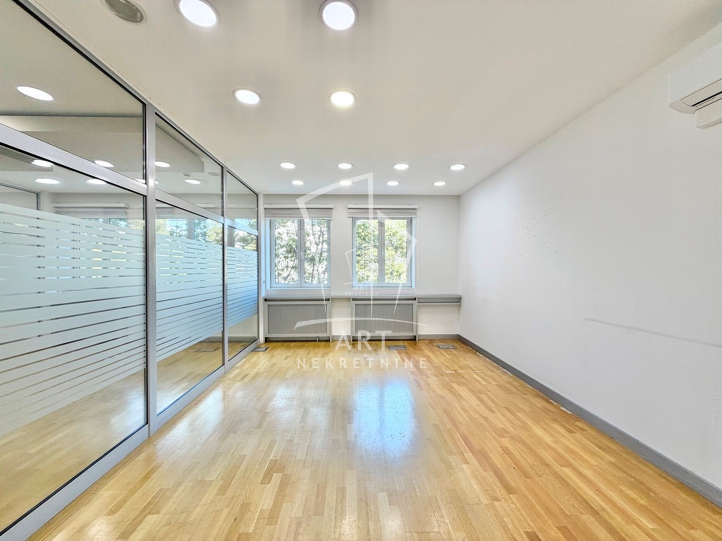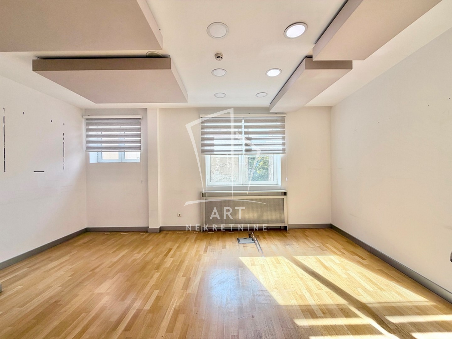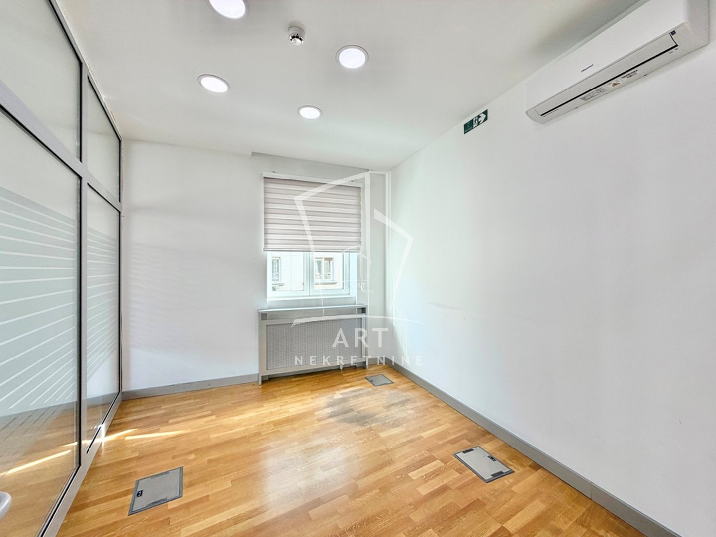 Prostor se dodatno može prilagođavati potrebama zakupca, pošto su pregrade aluminijum staklo. Ima dva ulaza i nalazi se sam na spratu.Optički internet je dostupan u zgradi. Prostor će biti ogrečen i očišćen pre ulaska novog zakupca.Servisni troškovi su 5.55 Evra/m2