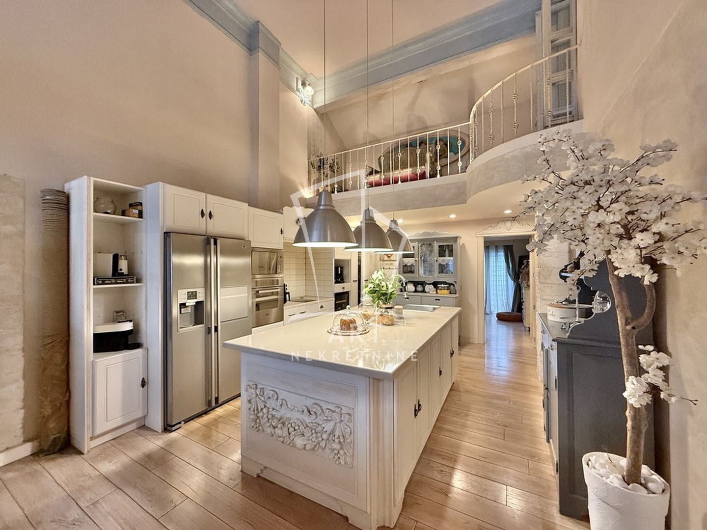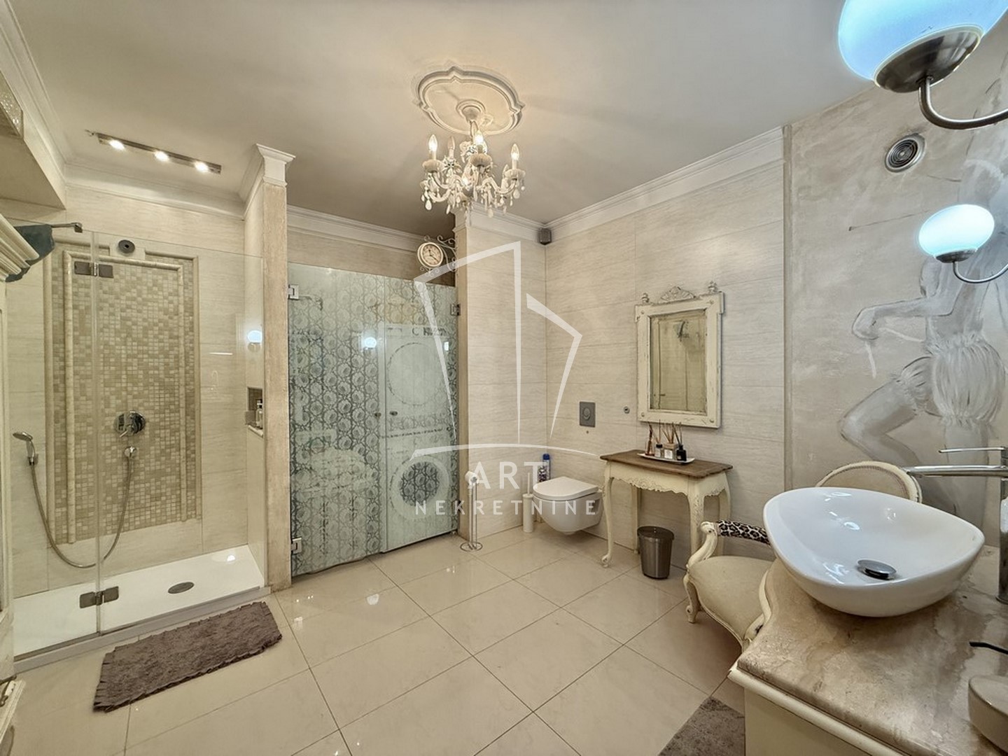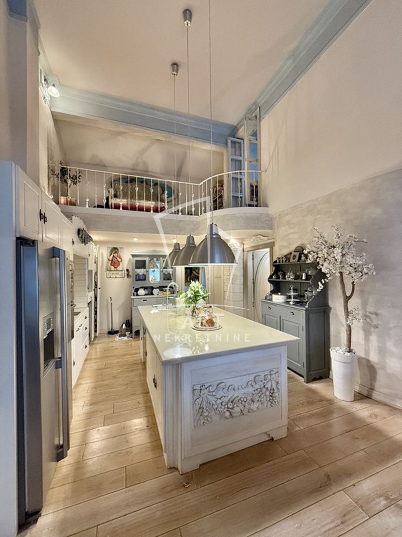 Sastoji se od velike dnevne sobe (visina plafona 5m), 4 spavaće sobe, kuhinje, kupatila, 2 terase, ostave i galerije-terase.