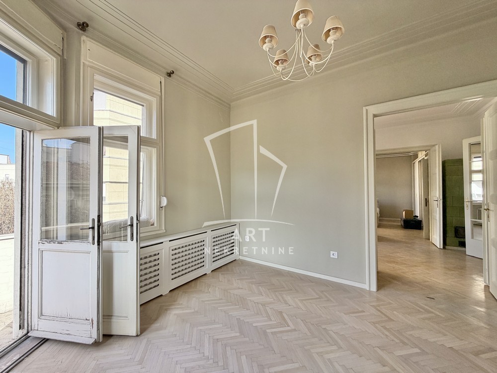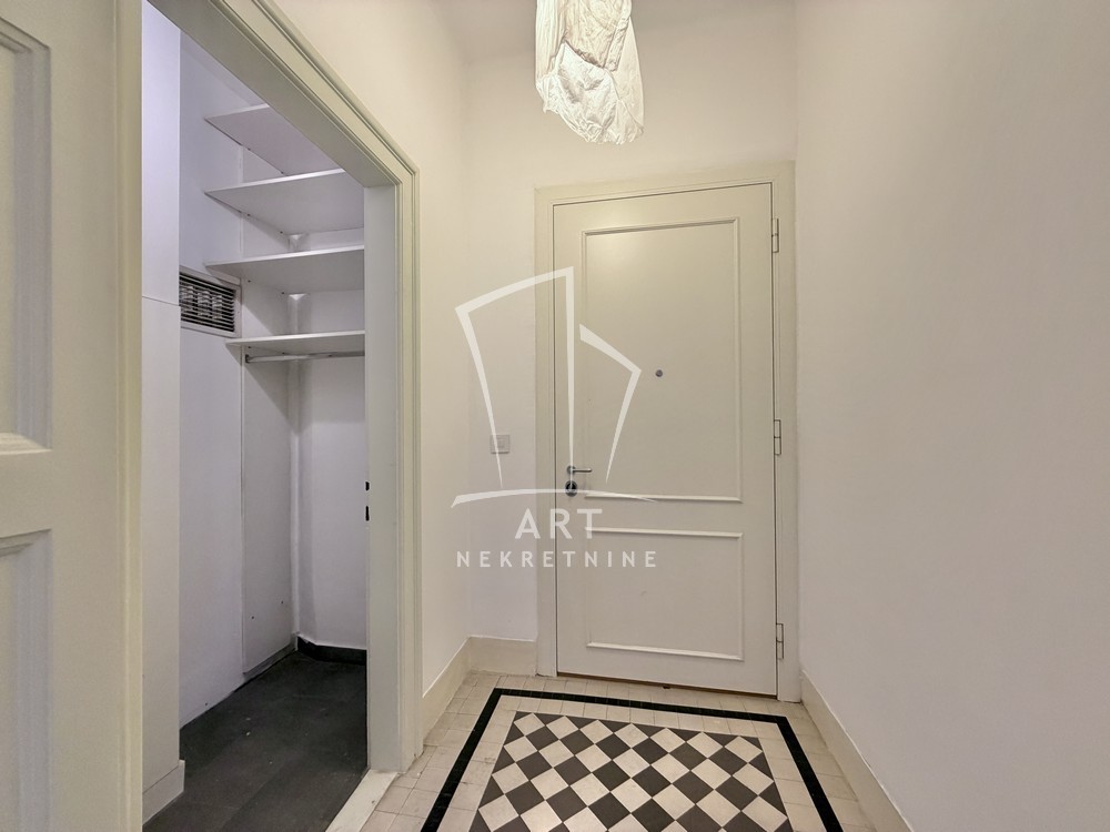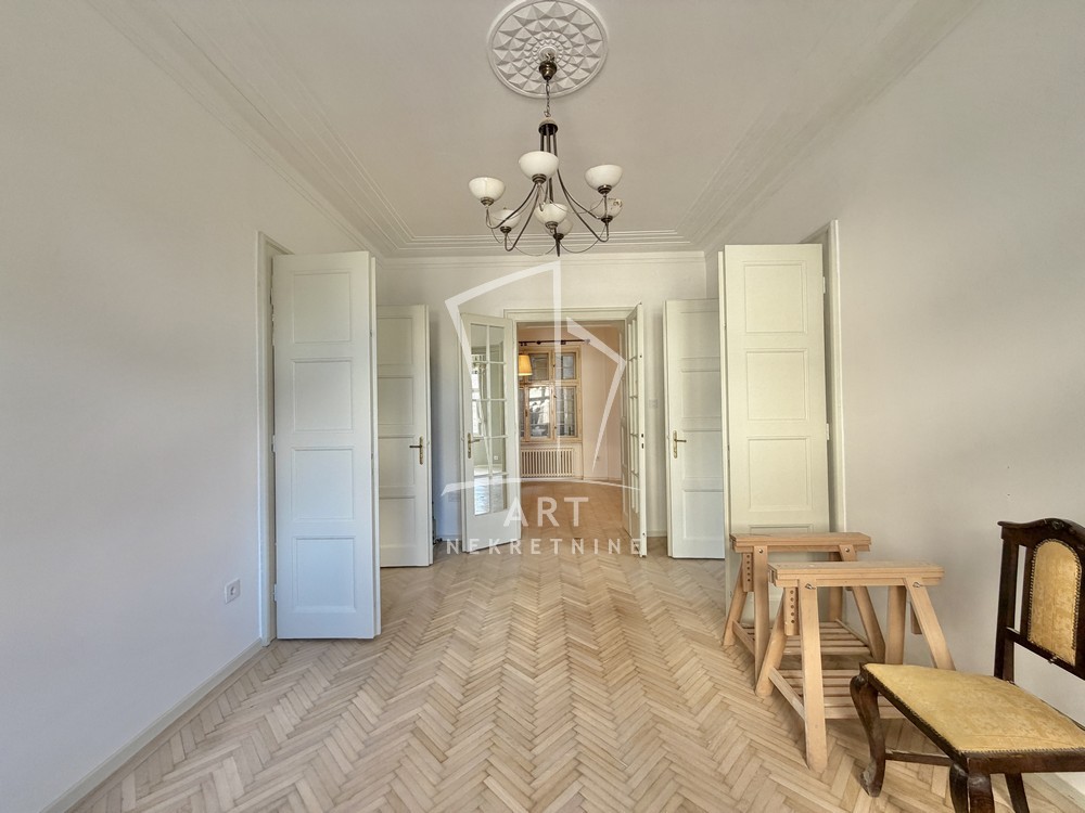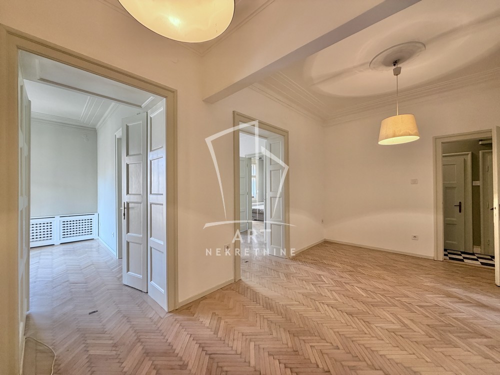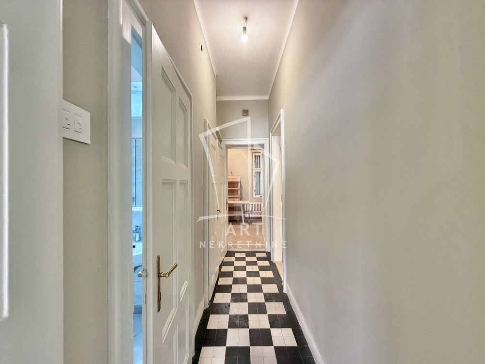 Prostorije: predsoblje, ulazni salon (ima prozor), 3 sobe, kupatilo, ostava, wc, kuhinja sa trpezarijom, 2 balkona i terasa.