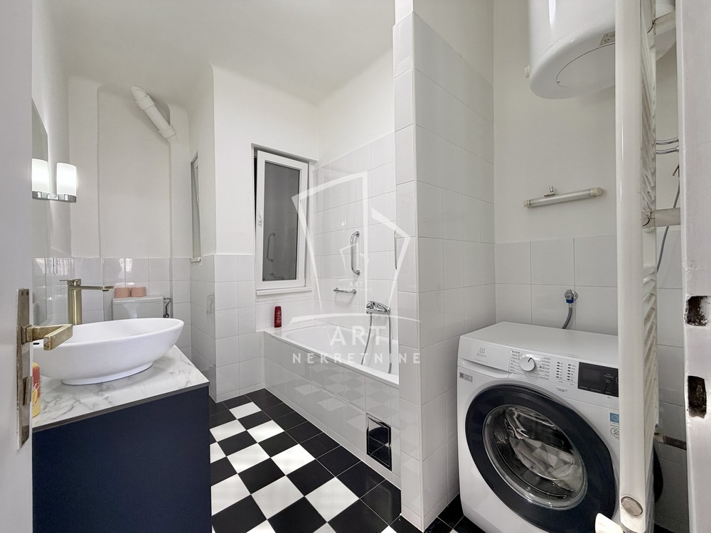 Stan je na čevrtom spratu, potpuno je renoviren, pri čemu je očuvana salonska struktura, dvostrano je orjentisan i ima kompletnu kuhinju sa kvalitetnom belom tehnikom.