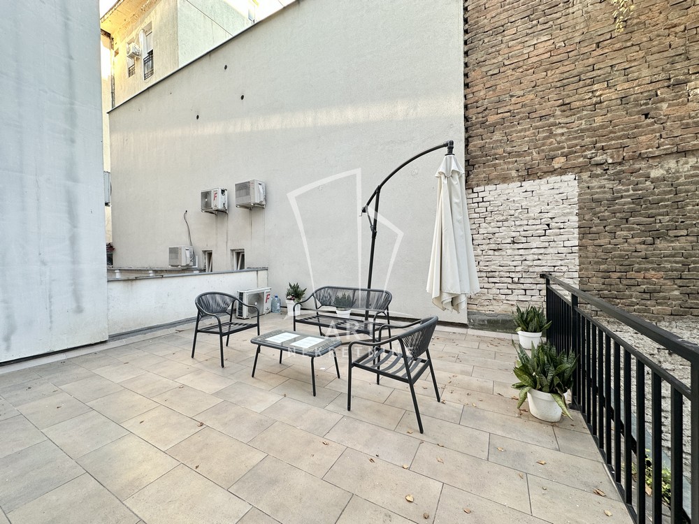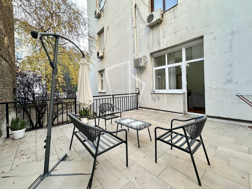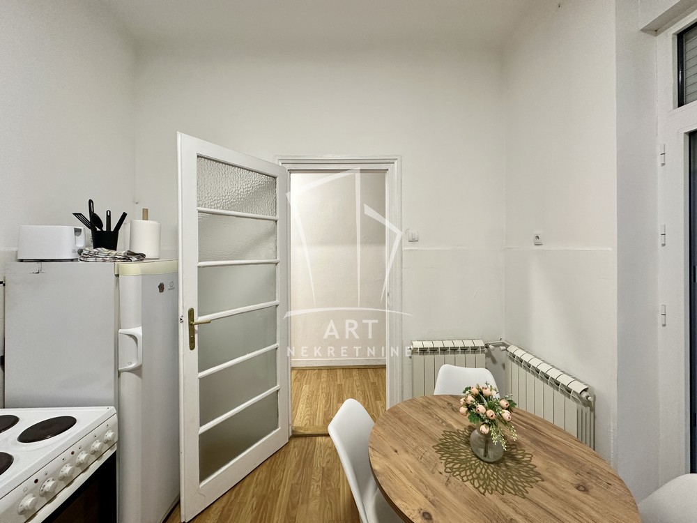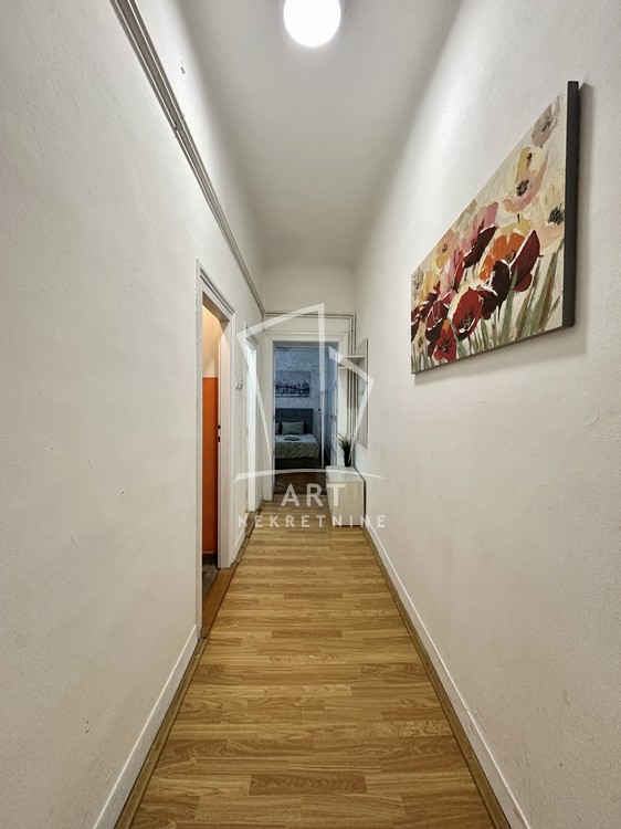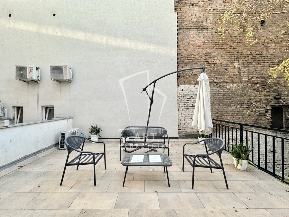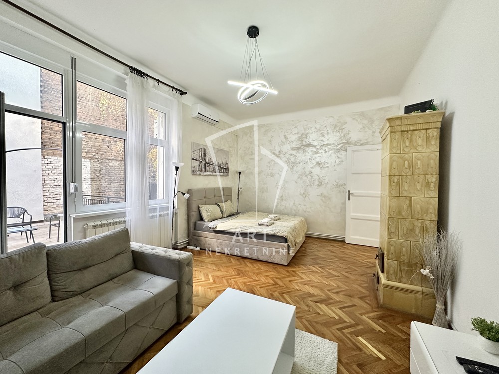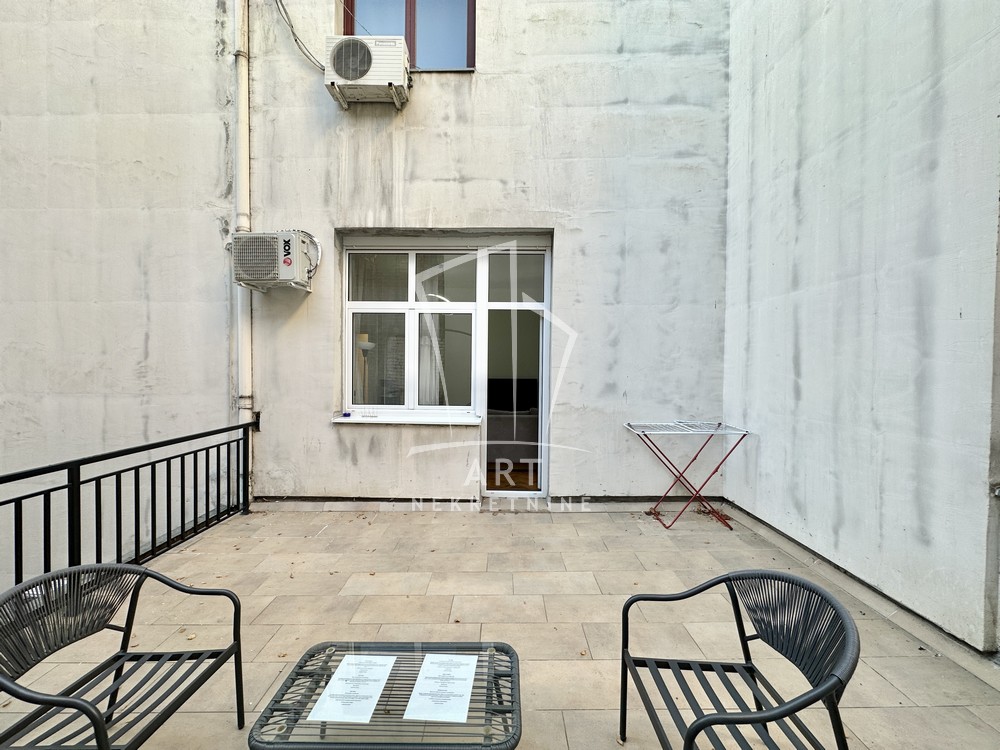 U prelepoj predratnoj zgradi na idealnom mestu u samom centru grada nalazi se uknjižen salonac korisne površine 53m2 + terasa od 33 m2 ka dvorištu, na prvom spratu od 4.spratova, cg, interfon, klima, podrum. Raspored prostorija : iz hodnika se ulazi u sve prostorije,dnevna soba sa izlazom na prostranu terasu od 30m2, zaklonjenu od pogleda, kupatilo, ostava, kuhinja sa trpezarijom i mala.
