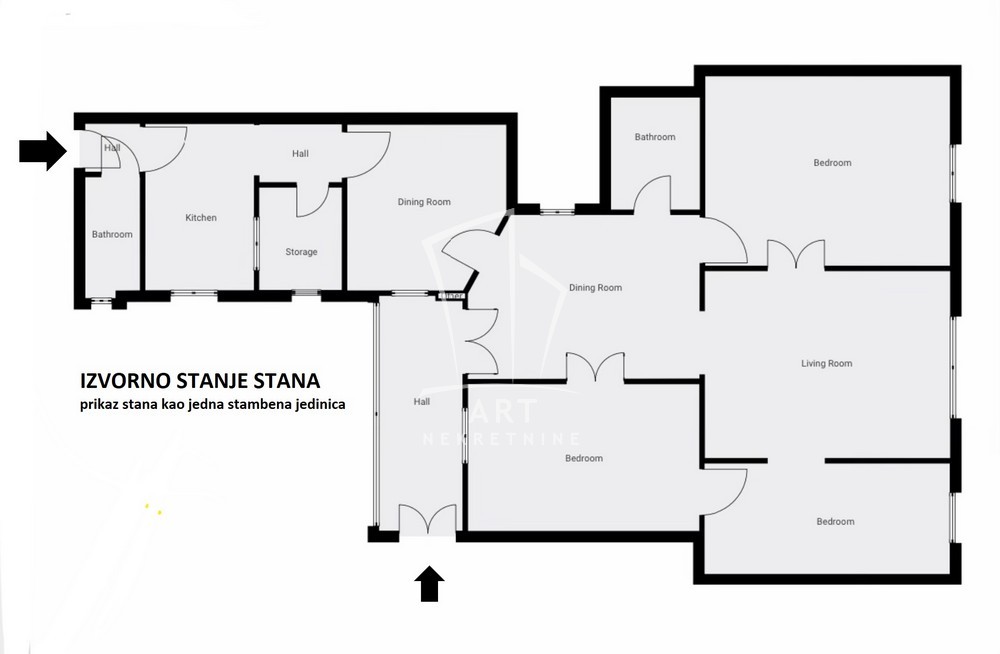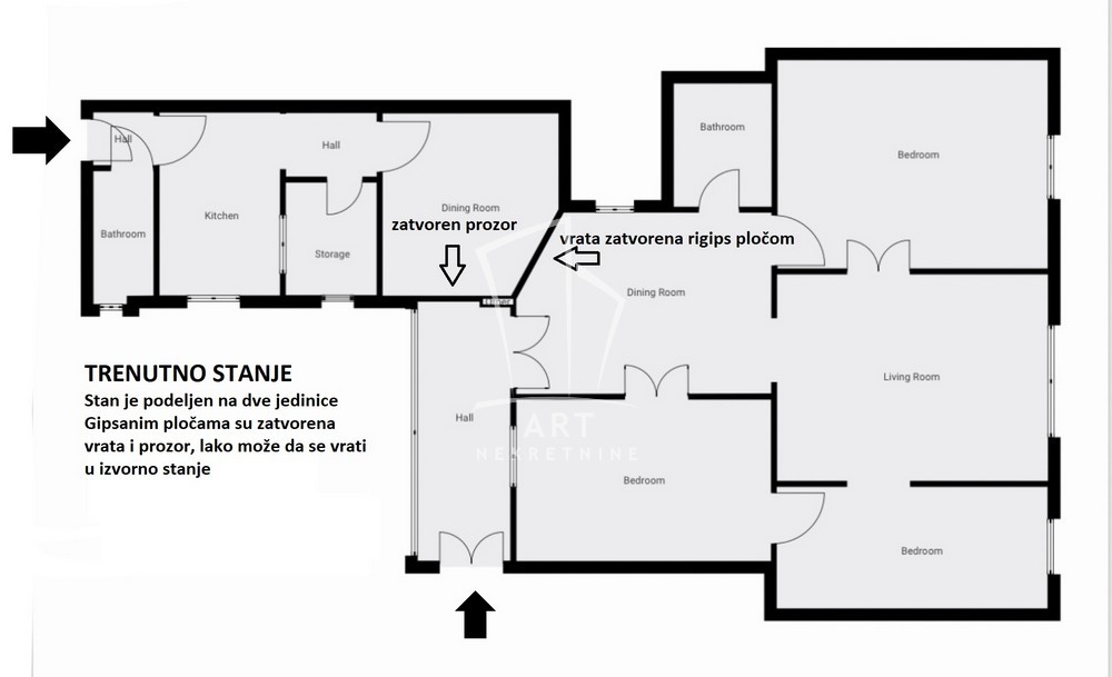 Trenutno je stan fizički podeljen na dve celine (gipsanim pločama zatvoreni su vrata i prozor ka ekonomskom delu).