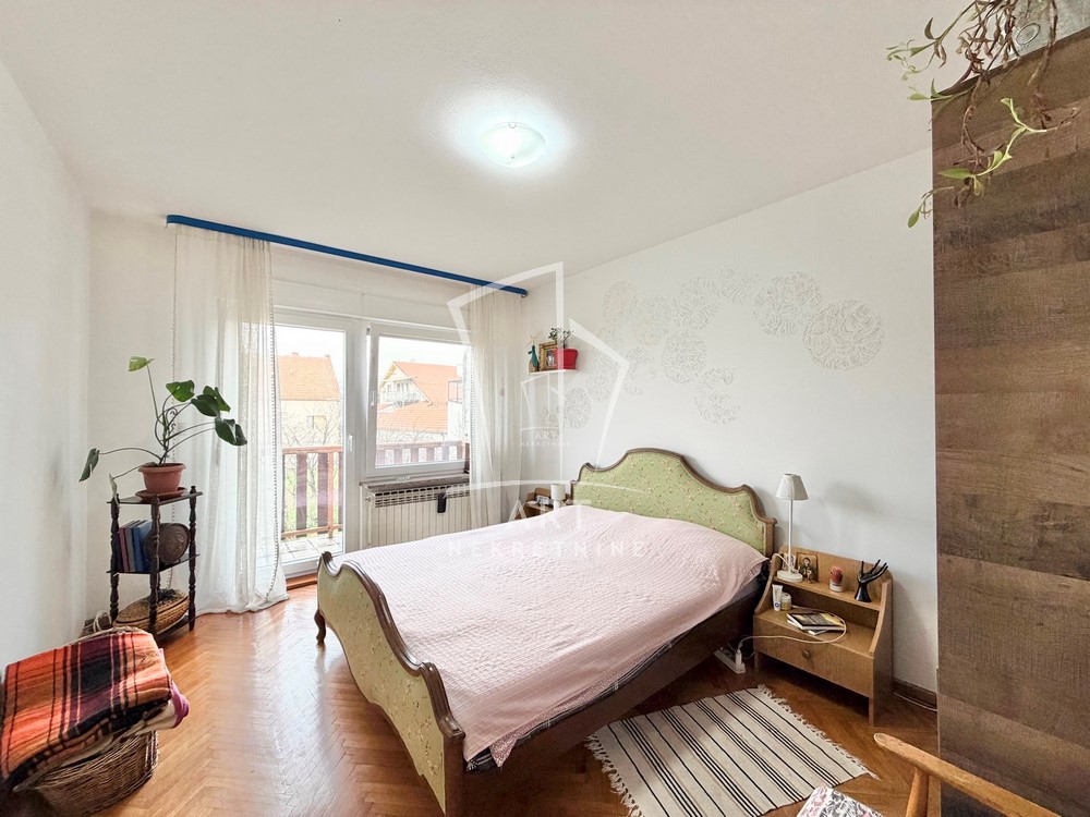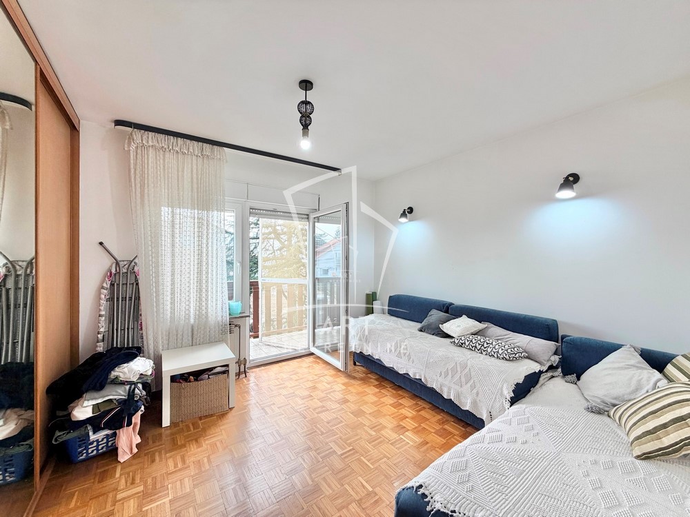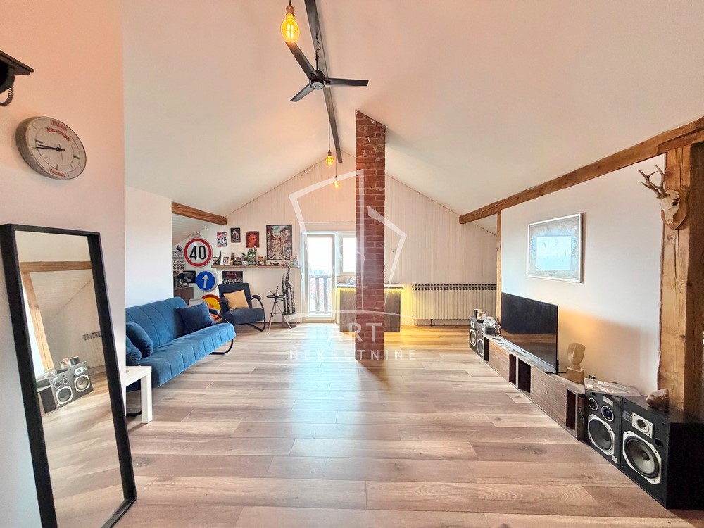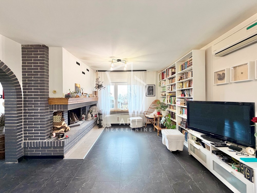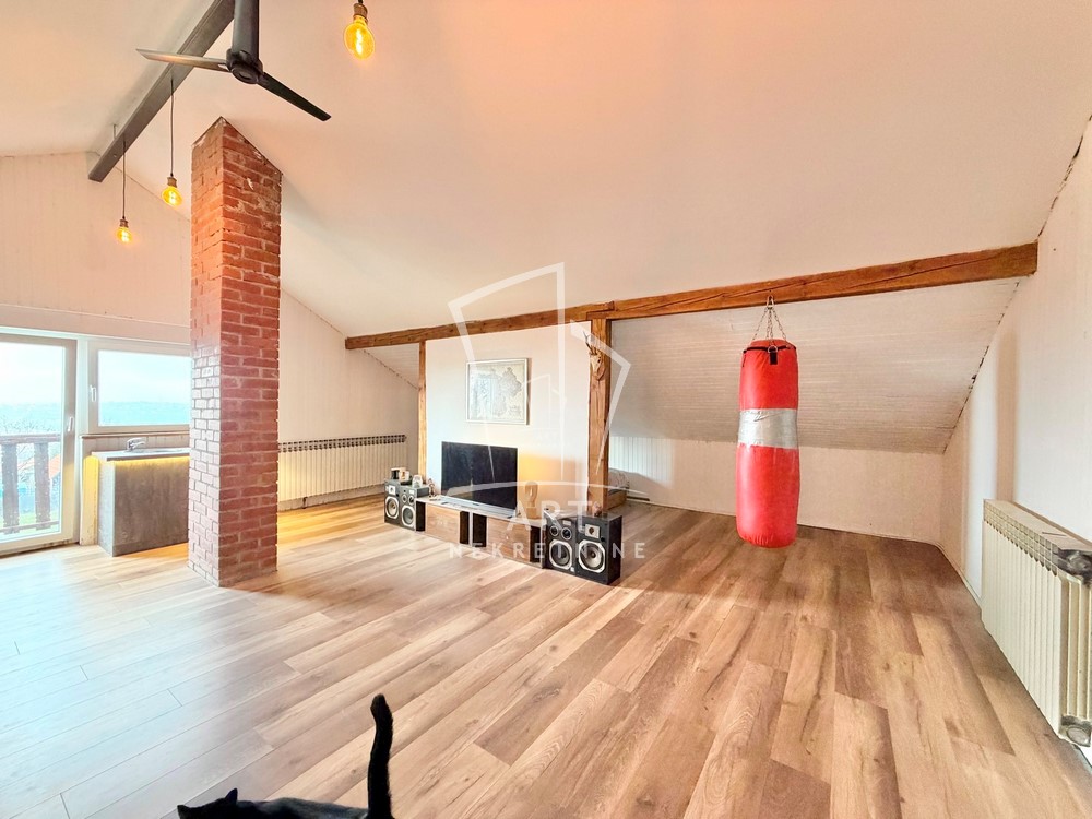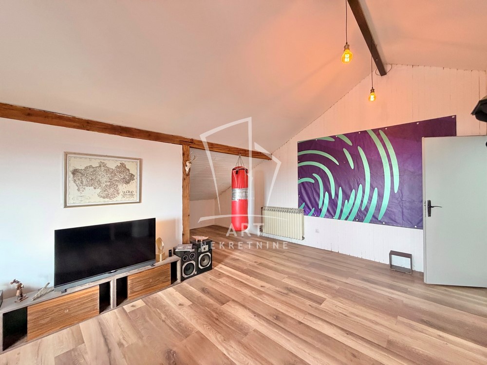 Prvi nivo predstavlja podrum sa garažom (za dva automobila) uknjižene površine 38m2, manje ostave ispod stepeništa, podrumske ostave od 12m2 i kotlarnice od 13m2. Drugi nivo je visoko prizemlje koje se sastoji od dnevnog boravka sa izlazom na terasu, kuhinja sa trpezarijom je prostrana sa izlazom na terasu od 16m2 čini jedinstvenu celinu, tu su još kupatilo i hodnik koji povezuje ove prostorije i stepenište. Treći nivo predstavlja spavaći deo sa tri spavaće sobe od kojih dve imaju izlaz na terasu, hodnik i kupatilo. Poslednji četvrti nivo je visoko potkrovlje urađeno kao posebna stambena celina otvorenog tipa sa dnevnim boravkom i kuhinjskim delom gde su pregradom odvojeni spavaći deo, garderober sa radnom sobom a ovaj nivo ima svoju posebnu terasu.
