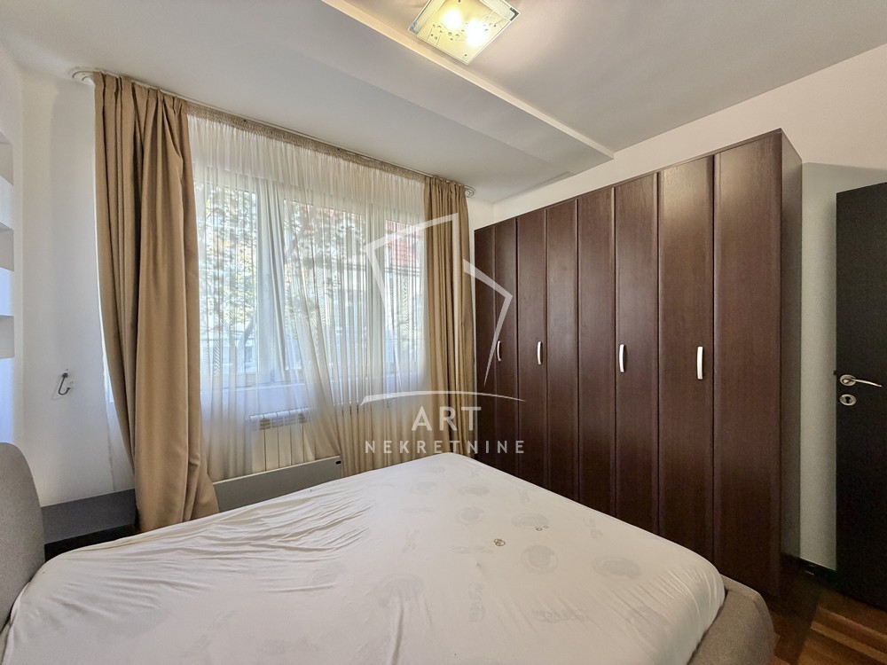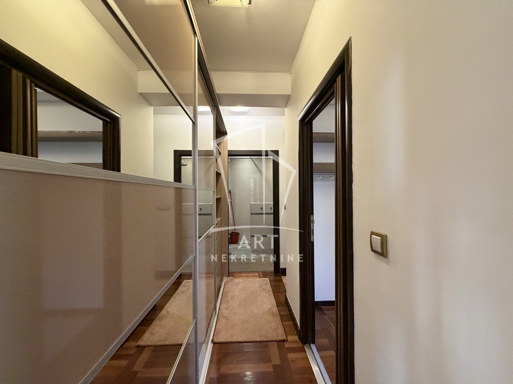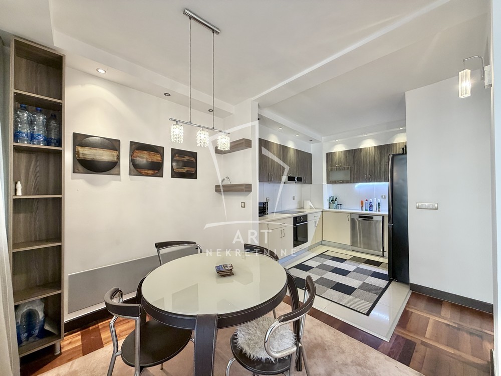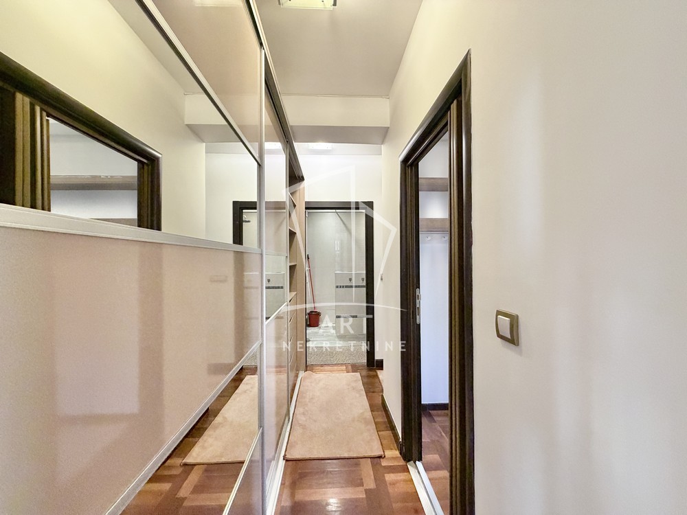 U ponudi je trosoban stan, kompletno namešten kvalitetnim nameštajem, smešten u zgradi novije gradnje u srcu Dorćola.