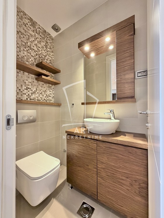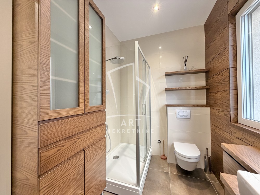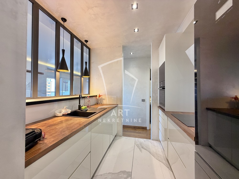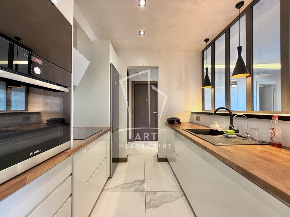 Izuzetan kvalitet završnih radova, podovi su od masiva hrasta i mermera, ugradni elementi od furniranog drveta, kuhinja opremljena Bosch uređajima.