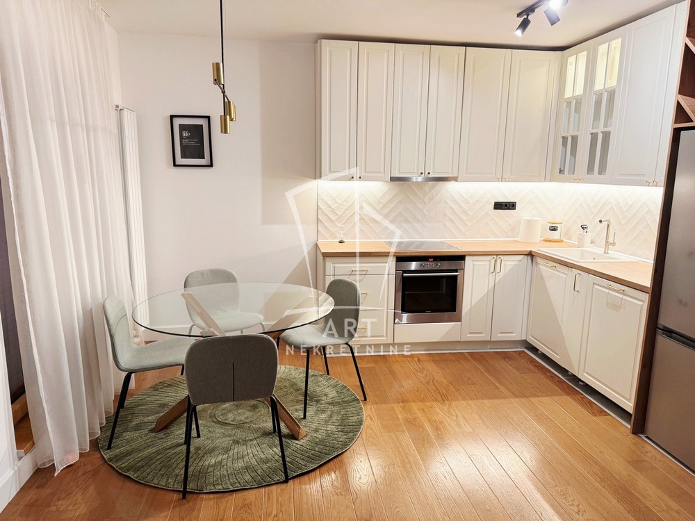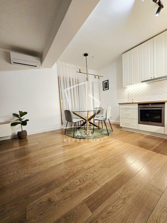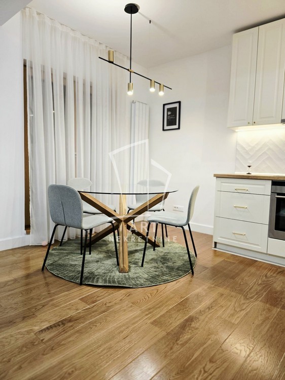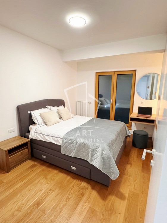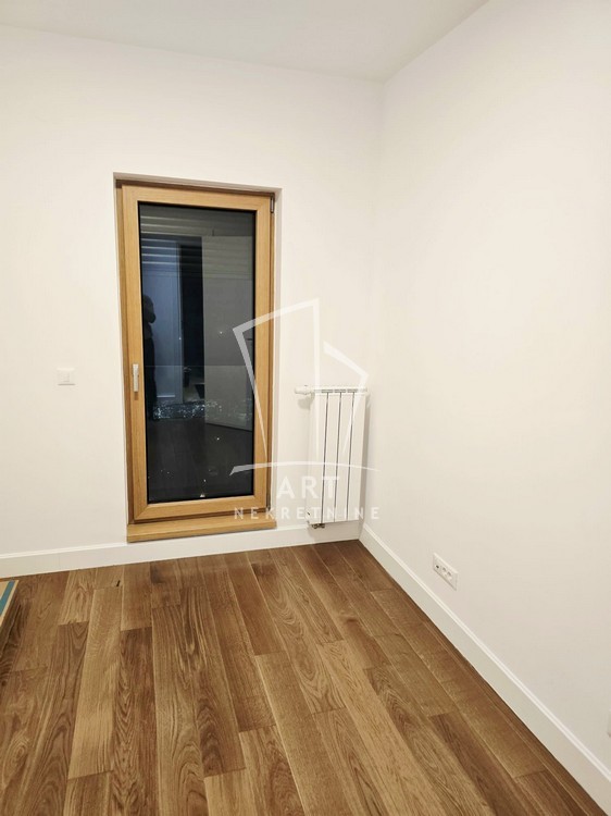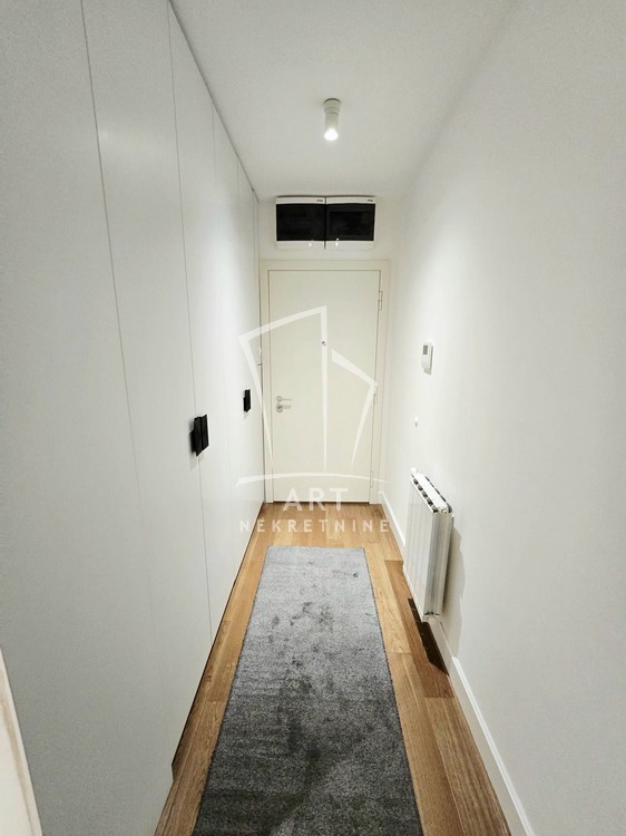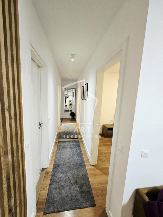 Sastoji se iz ulaznog hodnika,dnevnog boravka sa kuhinjsko trpezarijskim delom,dva kupatila,dve sobe od kojih će manja biti opremljena po želji zakupca i terase.