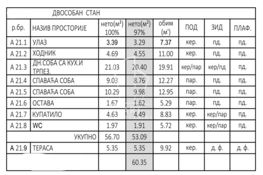 Stan se sastoji od ulazne zone, dnevnog boravka, kuhinje sa trpezarijom, dve spavaće sobe, kupatila, toaleta, terase i ostave.