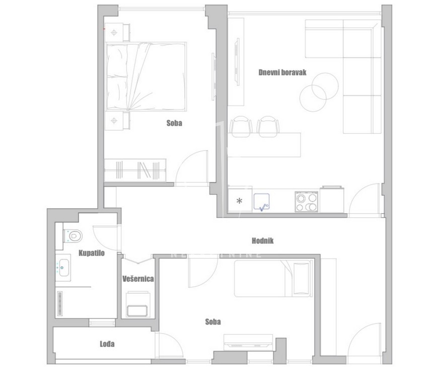 Prostorije, hodnik, dnevna soba, 2 spavaće sobe, kupatilo, ostava, lođa.