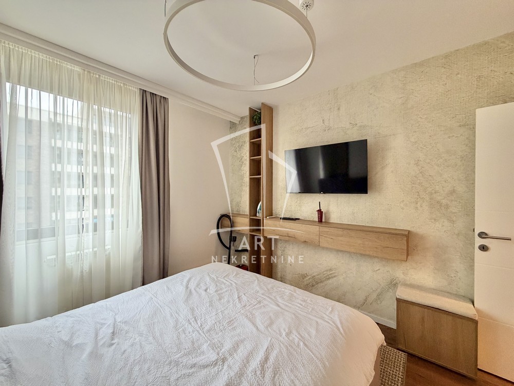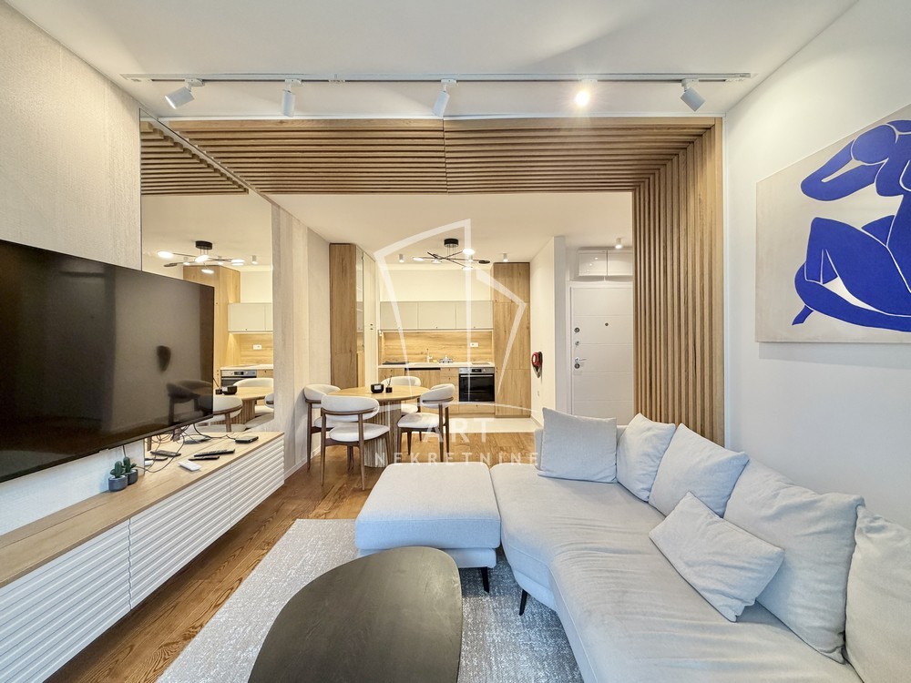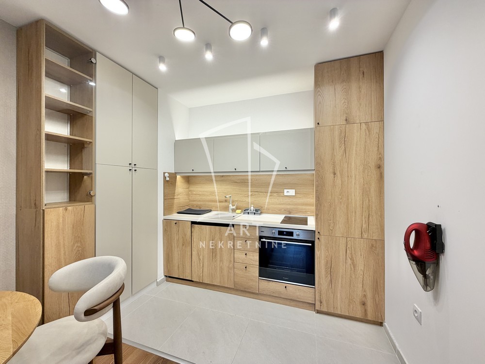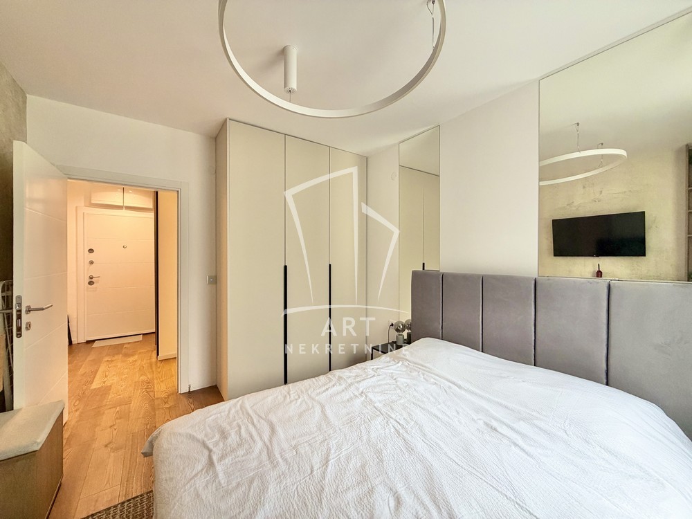 Stan se sastoji iz komforne dnevne sobe sa kuhinjom i trpezarijom, funkcionalnom spavaćom sobom, kupatilom i terasom. Stan poseduje i garažno mesto koje ulazi u cenu zakupa.