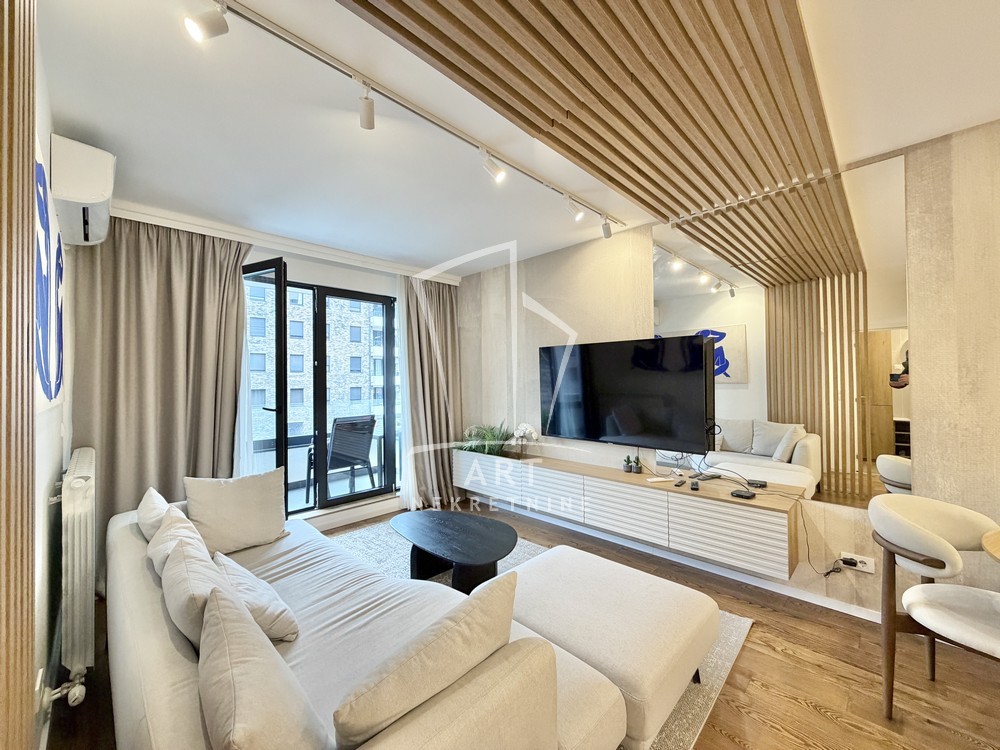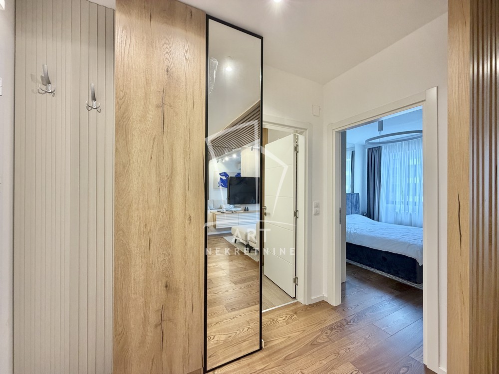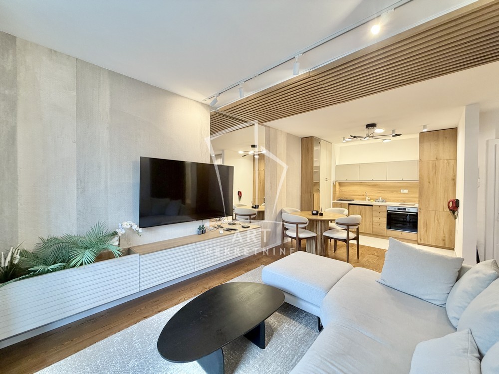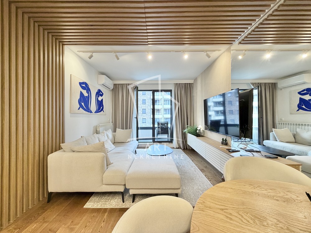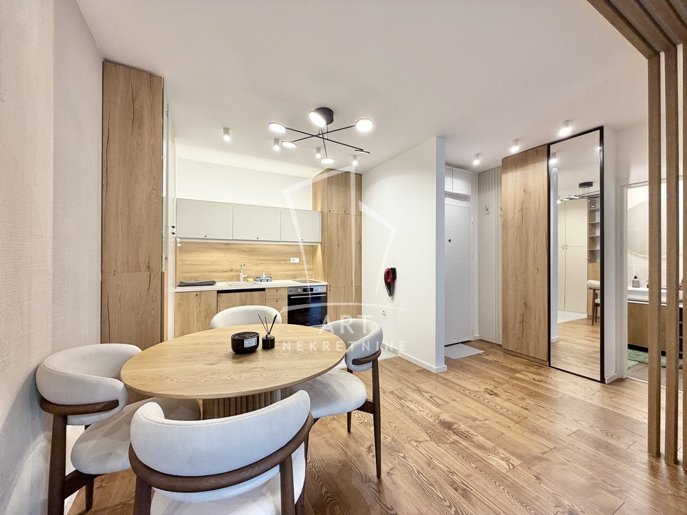 Stan se sastoji iz komforne dnevne sobe sa kuhinjom i trpezarijom, funkcionalnom spavaćom sobom, kupatilom i terasom. Stan poseduje i garažno mesto koje ulazi u cenu zakupa.