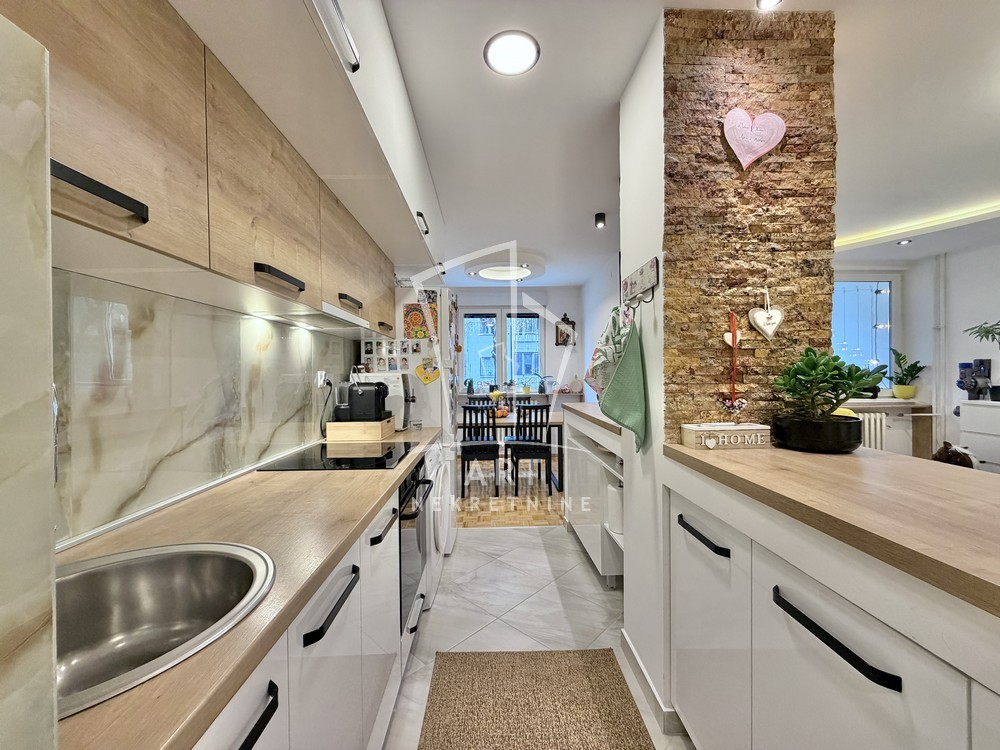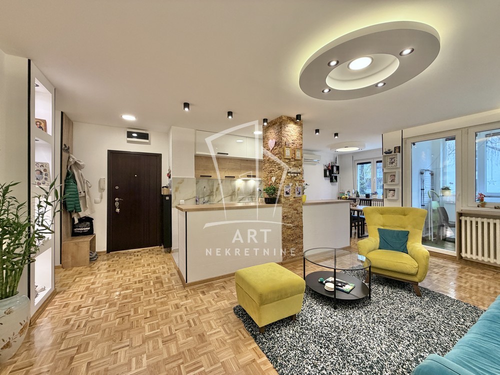 Prostorije: predsoblje, dnevna soba, kuhinja sa šankom, trpezarija, terasa, kupatilo, 2 spavaće sobe.