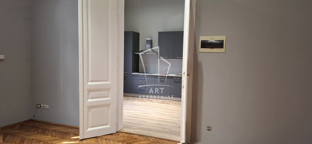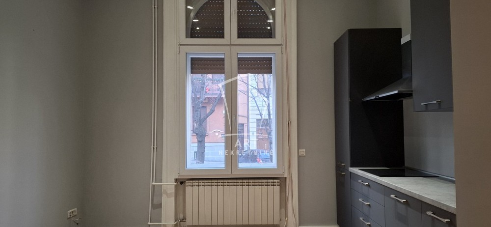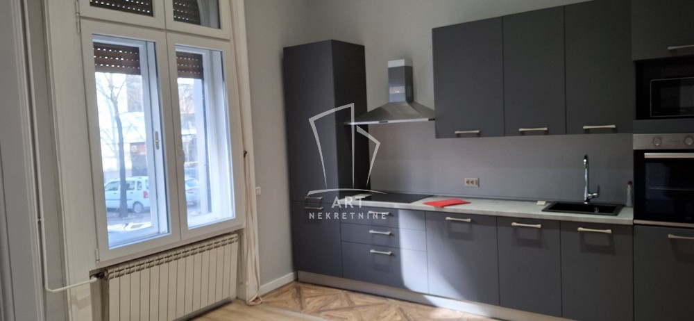 Prostor se sastoji od: malog ulaznog hodnika, dva odvojena mokra čvora - kupatilo i toalet, i još dve prostorije sa visokim plafonima: sobe i trpezarijsko-kuhinjskog dela sa potpuno novom, modernom kuhinjom. Zgrada je impozantne predratne arhitekture, kompletno renovirana, sa zajedničkim dvorištem.