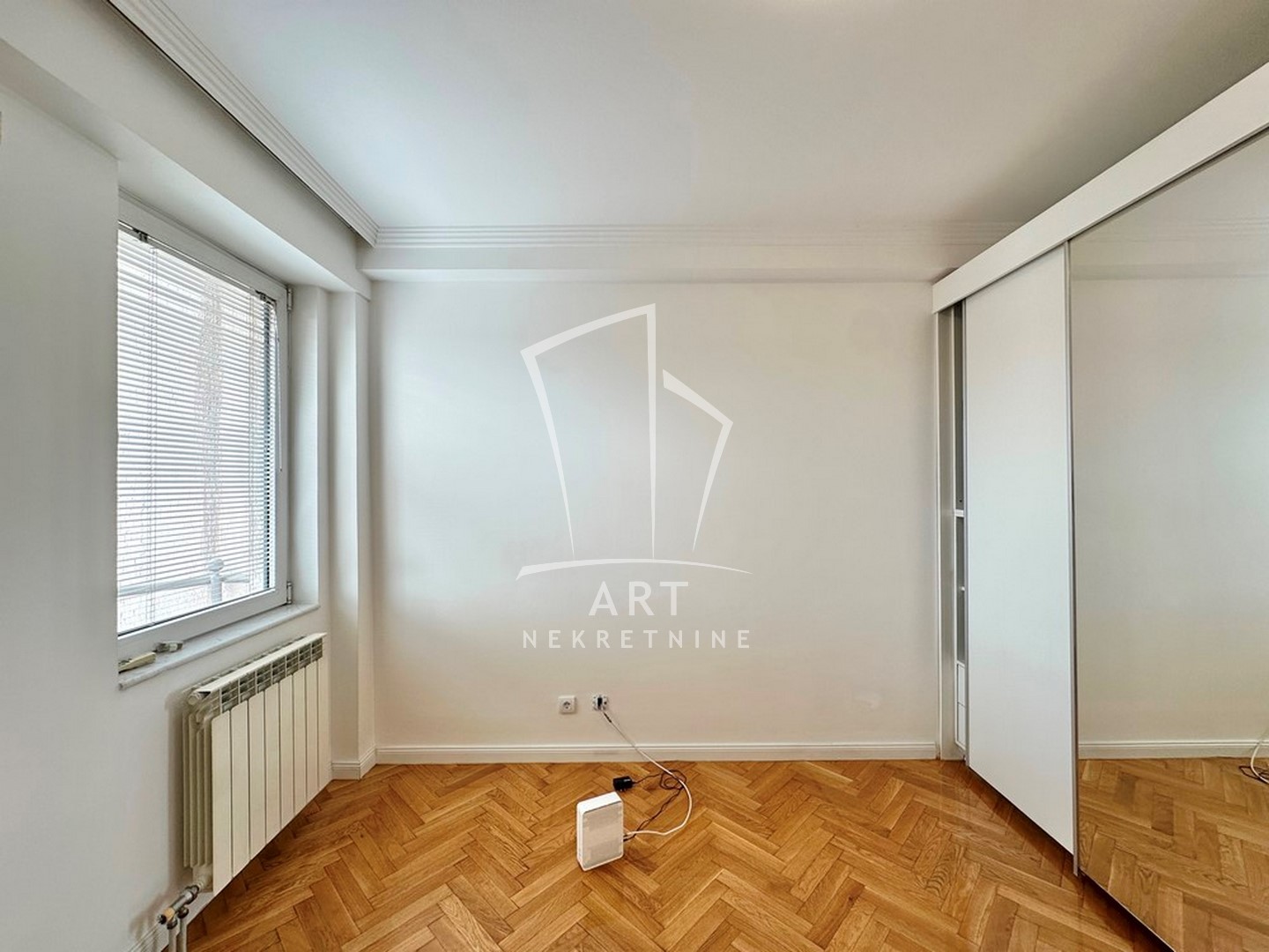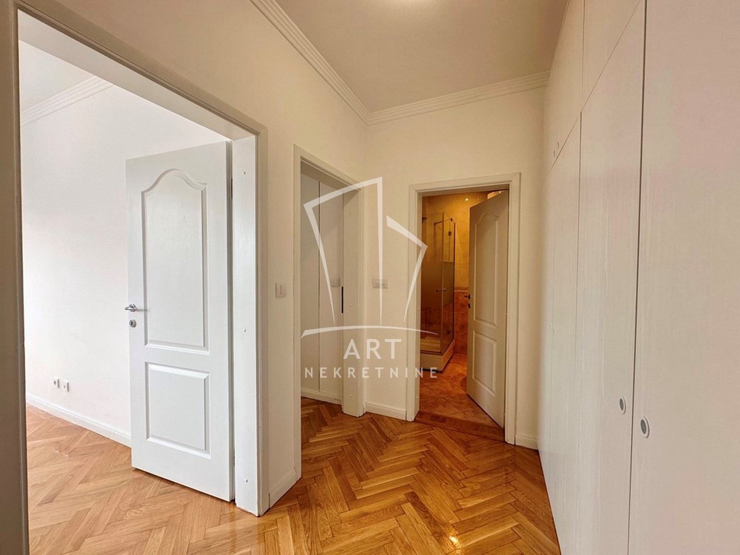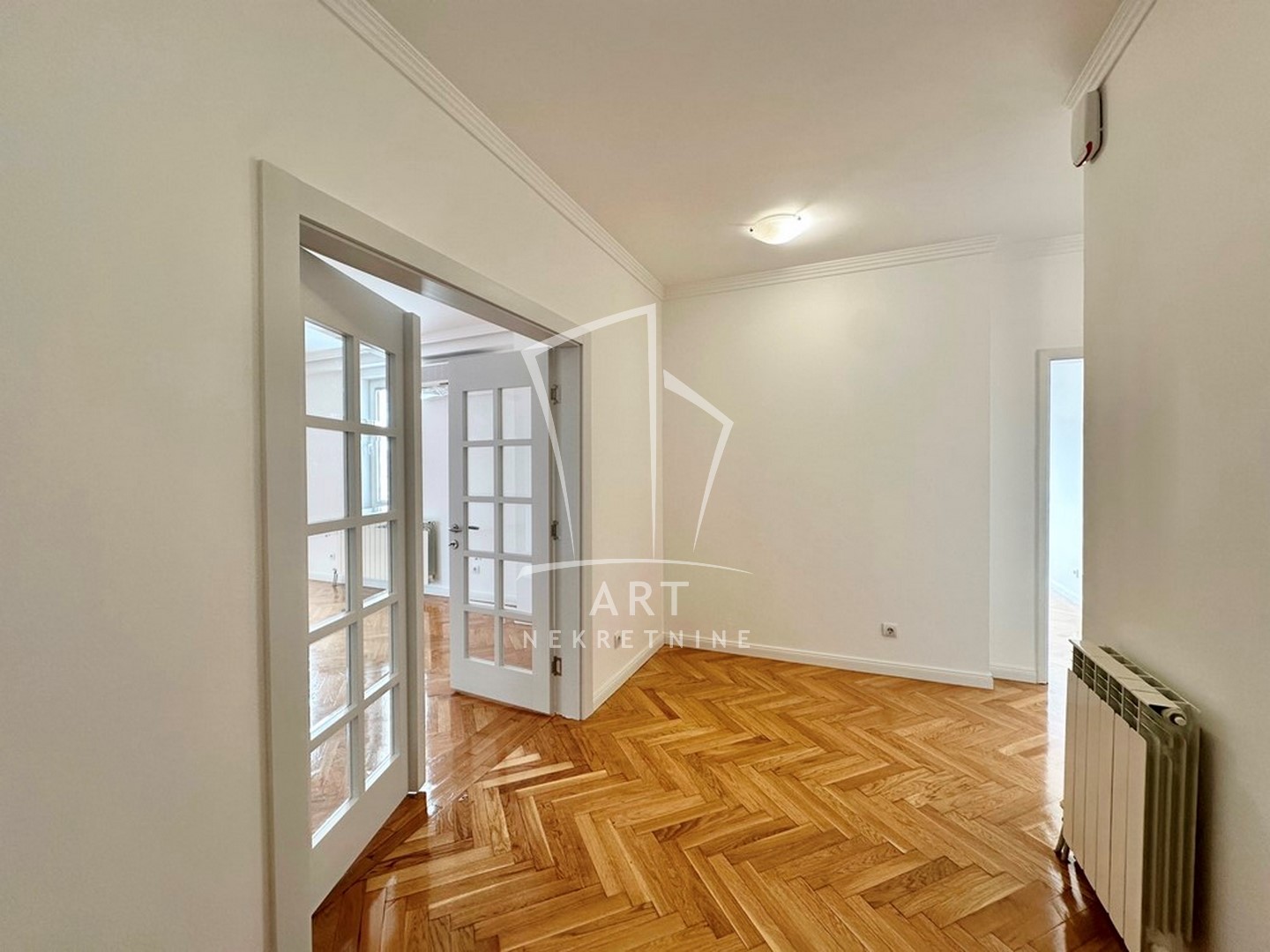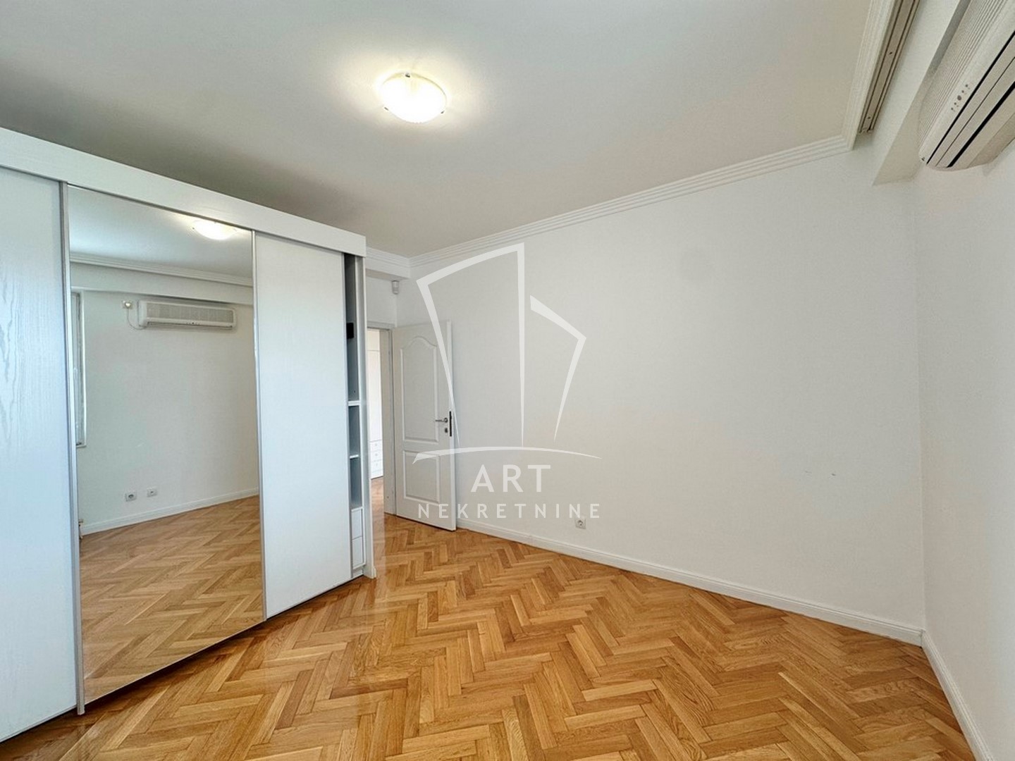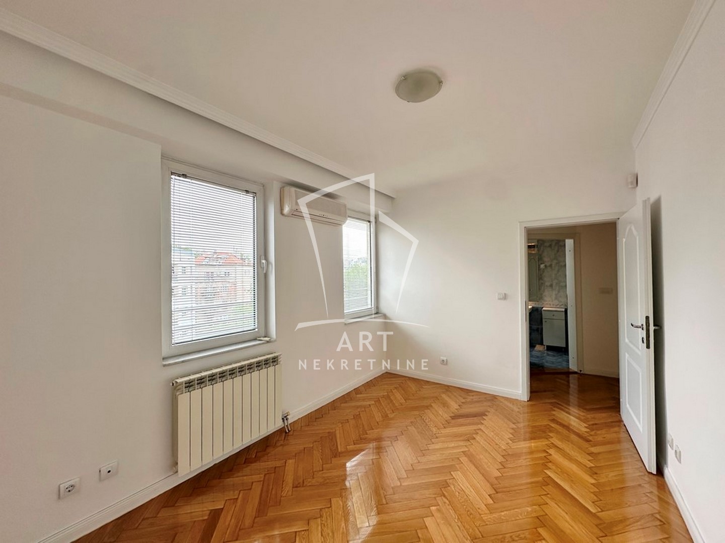 Izdaje se odličan stan u Nebojšinoj ulici.Sam na spratu ,četvrtom a zgrada ima V spratova.Svetao, dvostrano orijentisan.Spavaći blok odvojen sa zasebnim kupatilom za gospodarsku sobu. Veliki dnevni boravak salonskog tipa,kuhinja. Ima tri mokra čvora.Nema buke. Nenamešten.Ima svoju garažu za mali auto. Obavezan depozit.