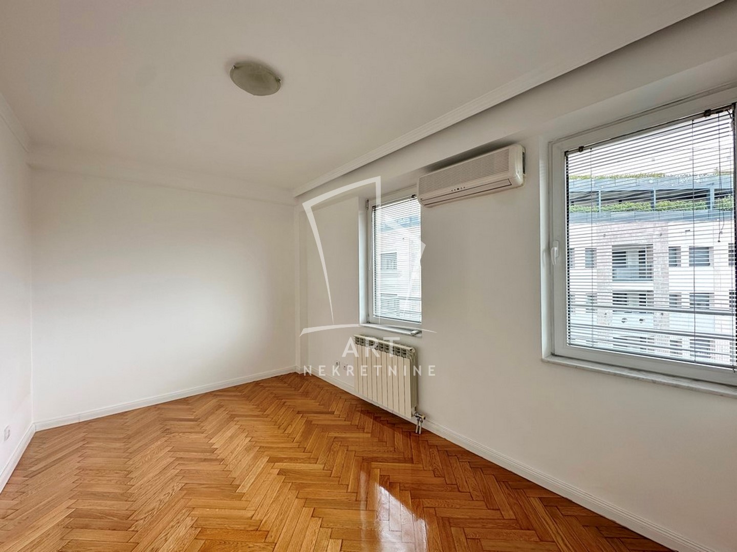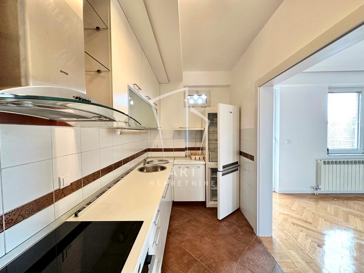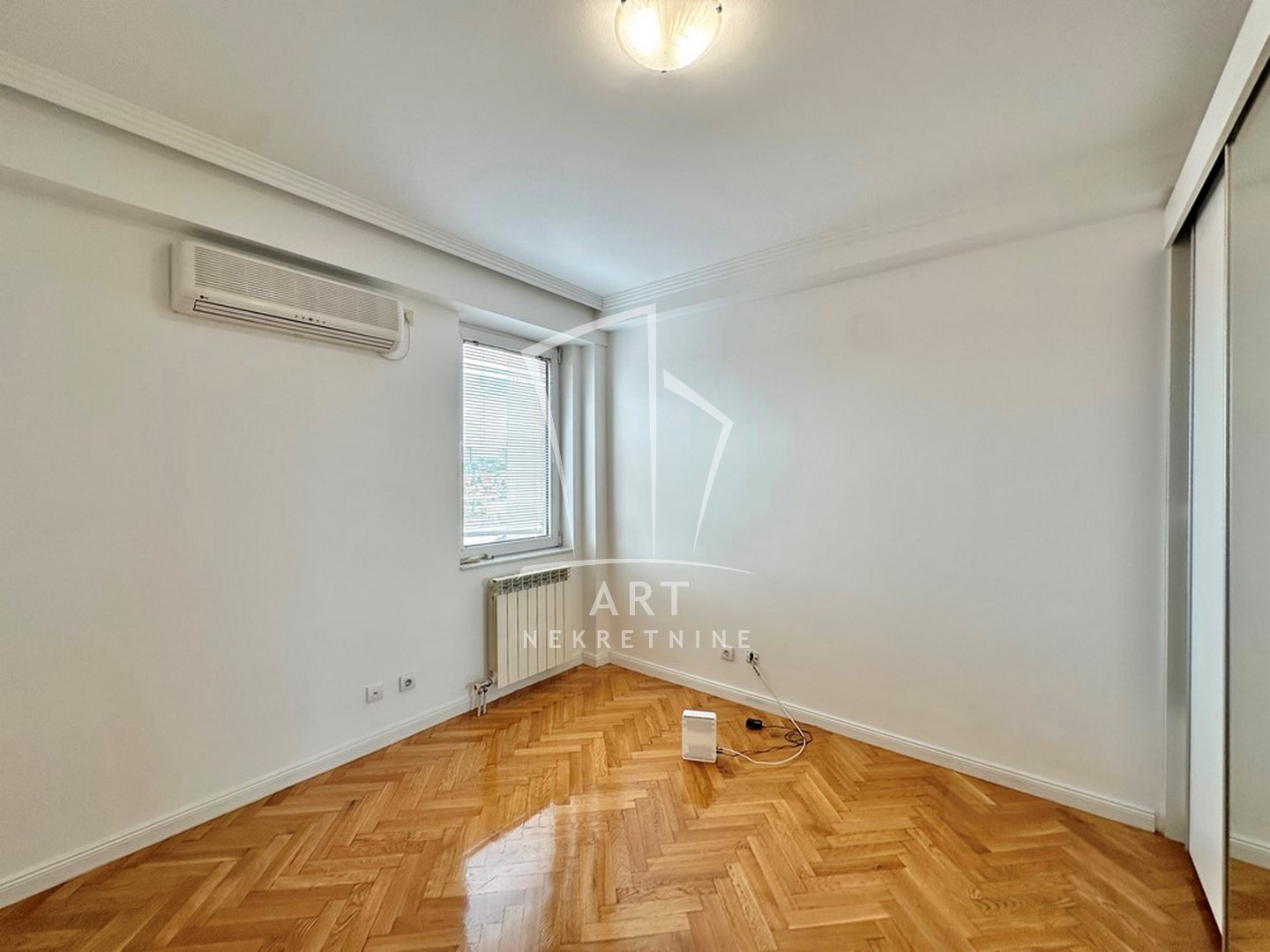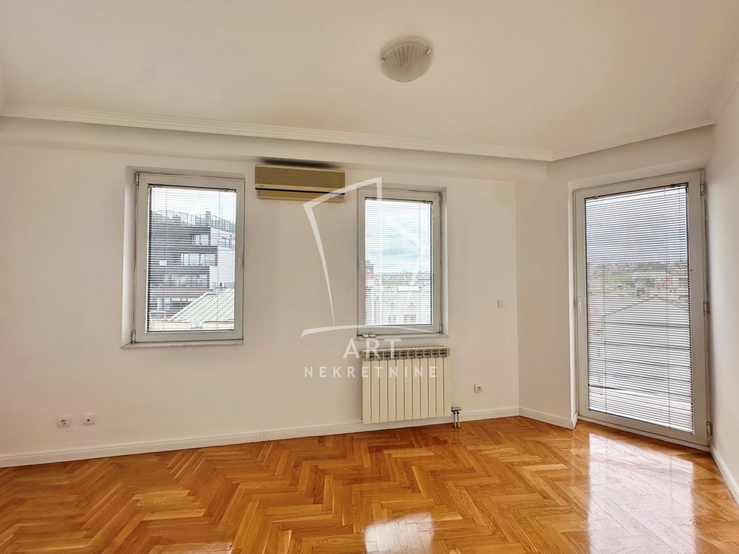 Izdaje se odličan stan u Nebojšinoj ulici.Sam na spratu ,četvrtom a zgrada ima V spratova.Svetao, dvostrano orijentisan.Spavaći blok odvojen sa zasebnim kupatilom za gospodarsku sobu. Veliki dnevni boravak salonskog tipa,kuhinja. Ima tri mokra čvora.Nema buke. Nenamešten.Ima svoju garažu za mali auto. Obavezan depozit.
