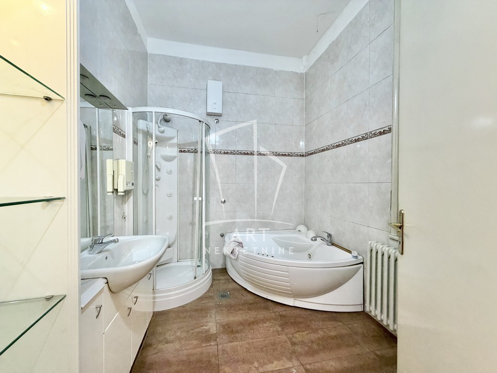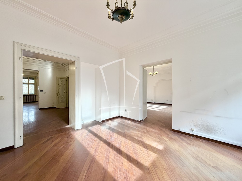 U uredno održavanoj zgradi, ovaj raskošan stan zauzima ceo sprat sa dva ulaza, ima 6 soba, 3 toaleta, 2 terase i balkon.