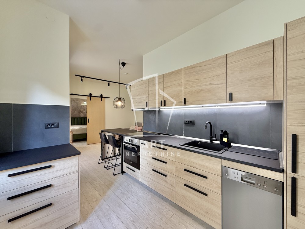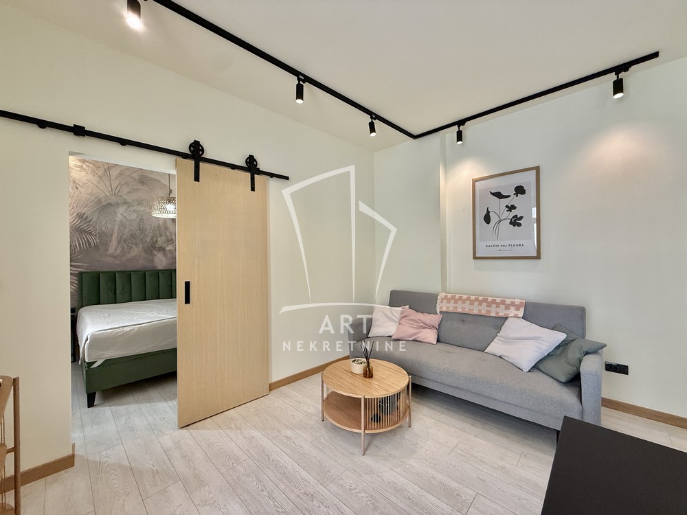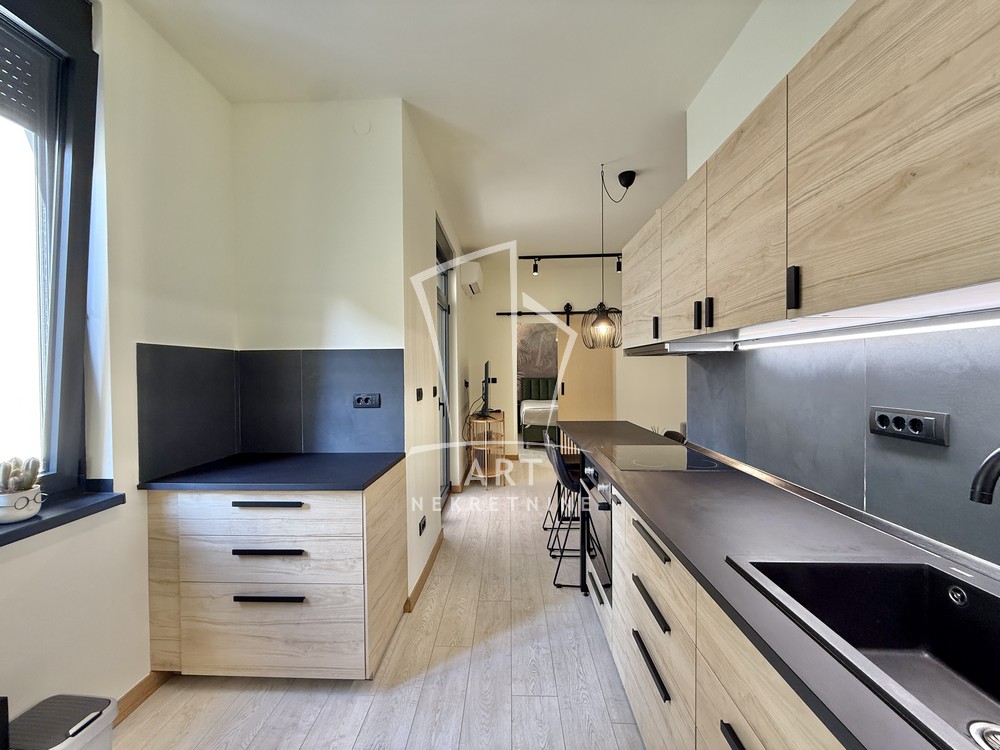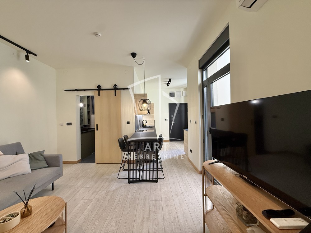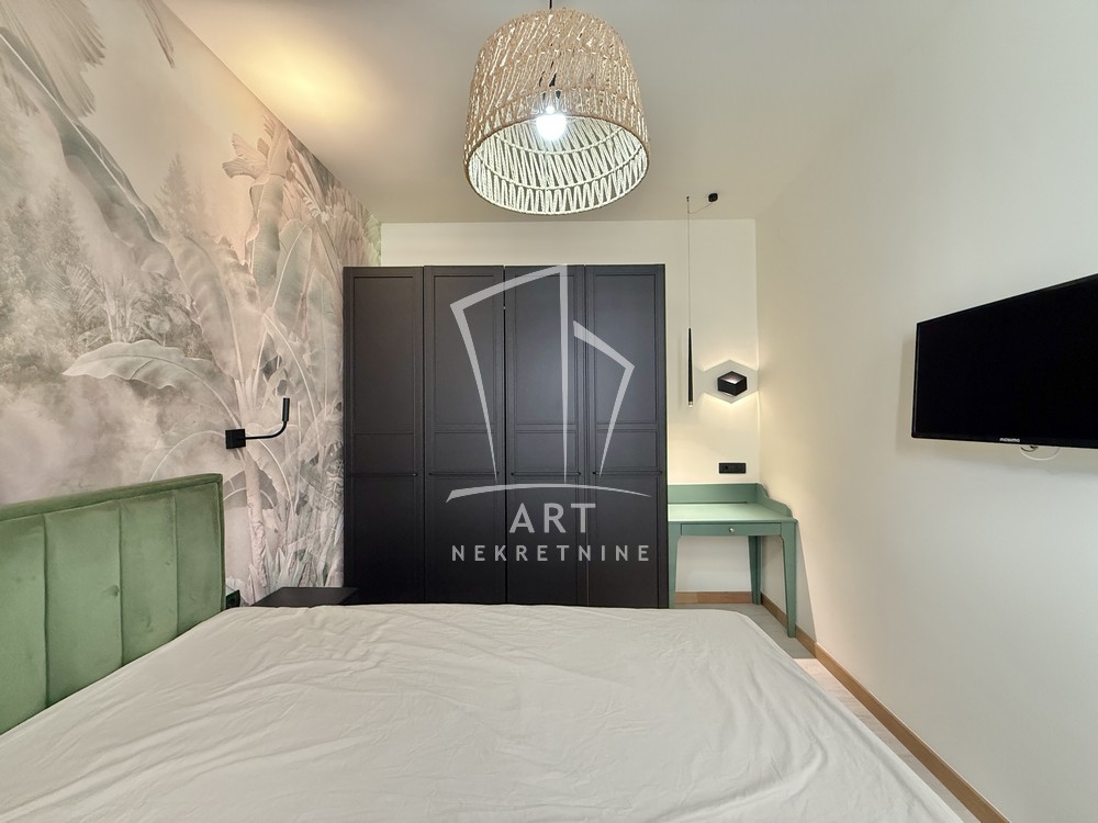 Raspored je funkcionalan i prostran: dnevna soba sa kuhinjom i trpezarijom i izlazom na terasu, spavaća soba i veliko, luksuzno kupatilo.