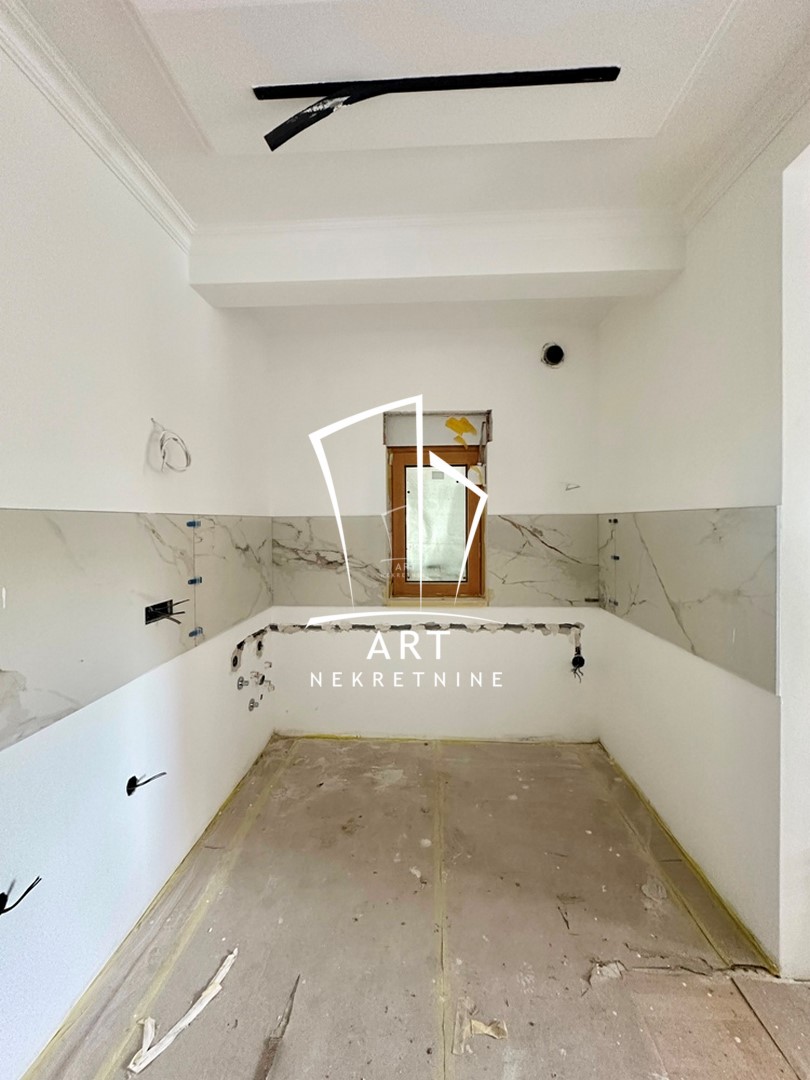 Novogradnja useljiva krajem ovog decembra. Prodaje se komplet namešten (sve novo i pod garancijom). U cenu ulazi i garažno mesto na klackalici. Uknjižen na 68m2 a mereno 70m2 plus lođa od 30m2. Stan sa maksimalnom zvučnom i toplotnom izolacijom u vidu "sendvič" zida i drvo-aluminijum stolarijom sa troslojnim staklom. Grejanje etažno na struju (električni kotao) u kupatilima i kuhinji podno grejanje. Poseban kotao za terasu plus podno grejanje. Takođe poseduje inverter klimu u svakoj prostoriji. Hrastov parket prve klase, španska keramika, ulazna atestirana sigurnosna vrata, bojeni furnir, krilo debljine 70mm. Sobna i kupatilska vrata beli medijapan. U stanu urađeni spušteni plafoni sa rasvetom u vidu led trake i elektro topova. Spavaće sobe krasi enterijer sa ukrasnim stiropor lajsnama. Stan kompletno opremljen sa svim kuhinjskim elementima, TV komodom, 2 plakara u spavaćim sobama, 2 king sajz kreveta, garniturom, plakarom u hodniku i komplet sanitarijom u oba kupatila.Terasa pokrivena pergolom sa rasvetom (sendvič panel) i termo-stopsol staklom 8mm. Takođe ostavljene instalacije za saunu i đakuzi.